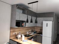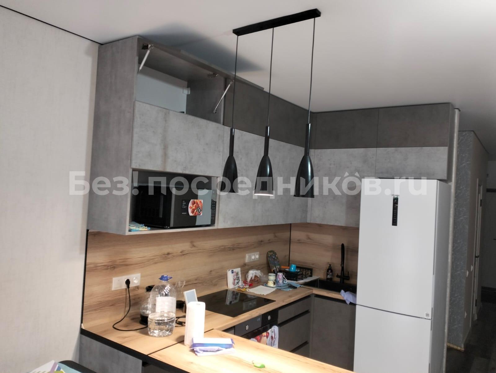 Просторная кухня-гостиная и спальня. Установлена новая кухня (кухонный гарнитур), есть плита, подставка под микроволновку и холодильник. Также имеется белый кухонный стол, 2 стула (этого нет на фото).
