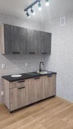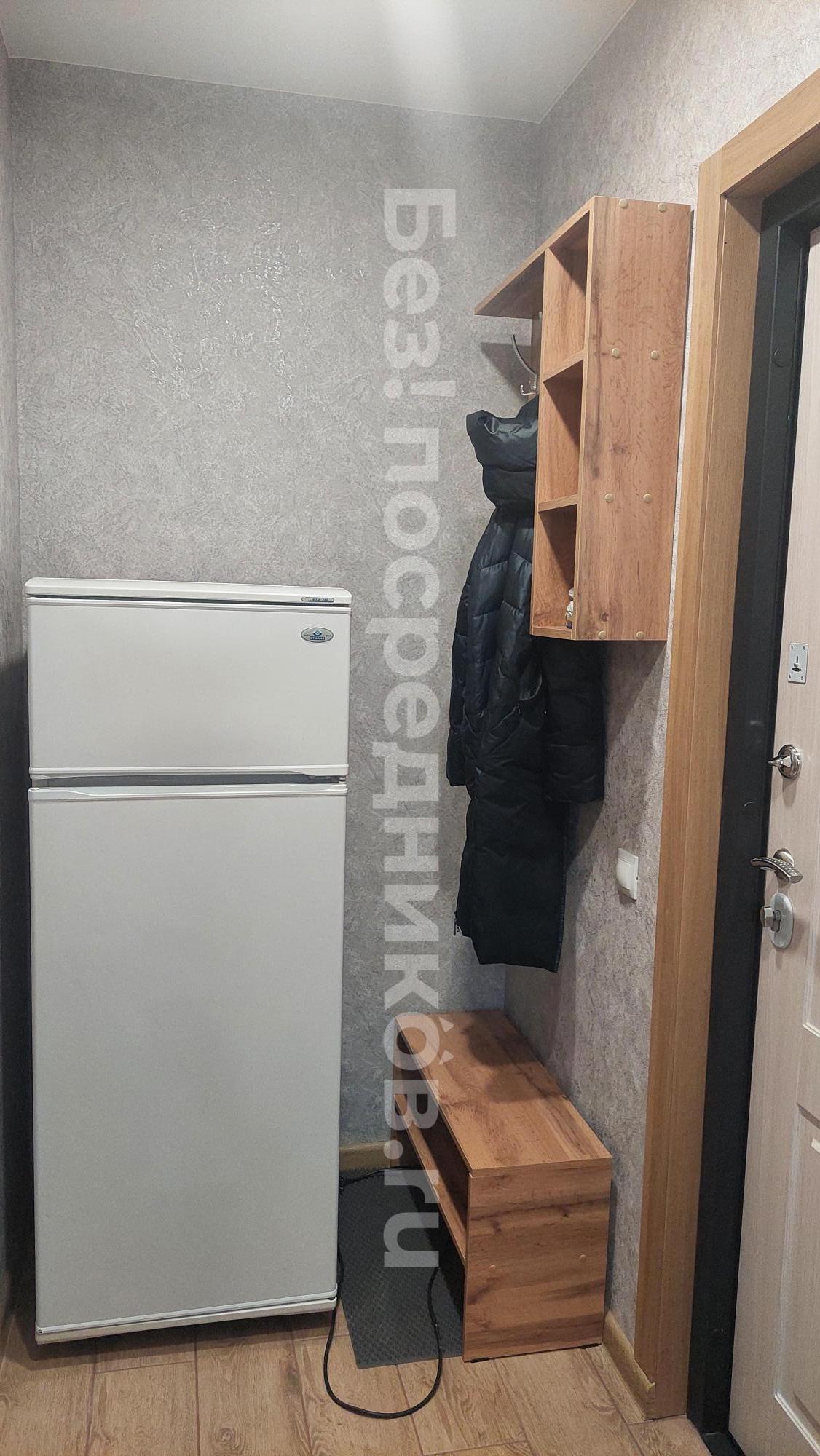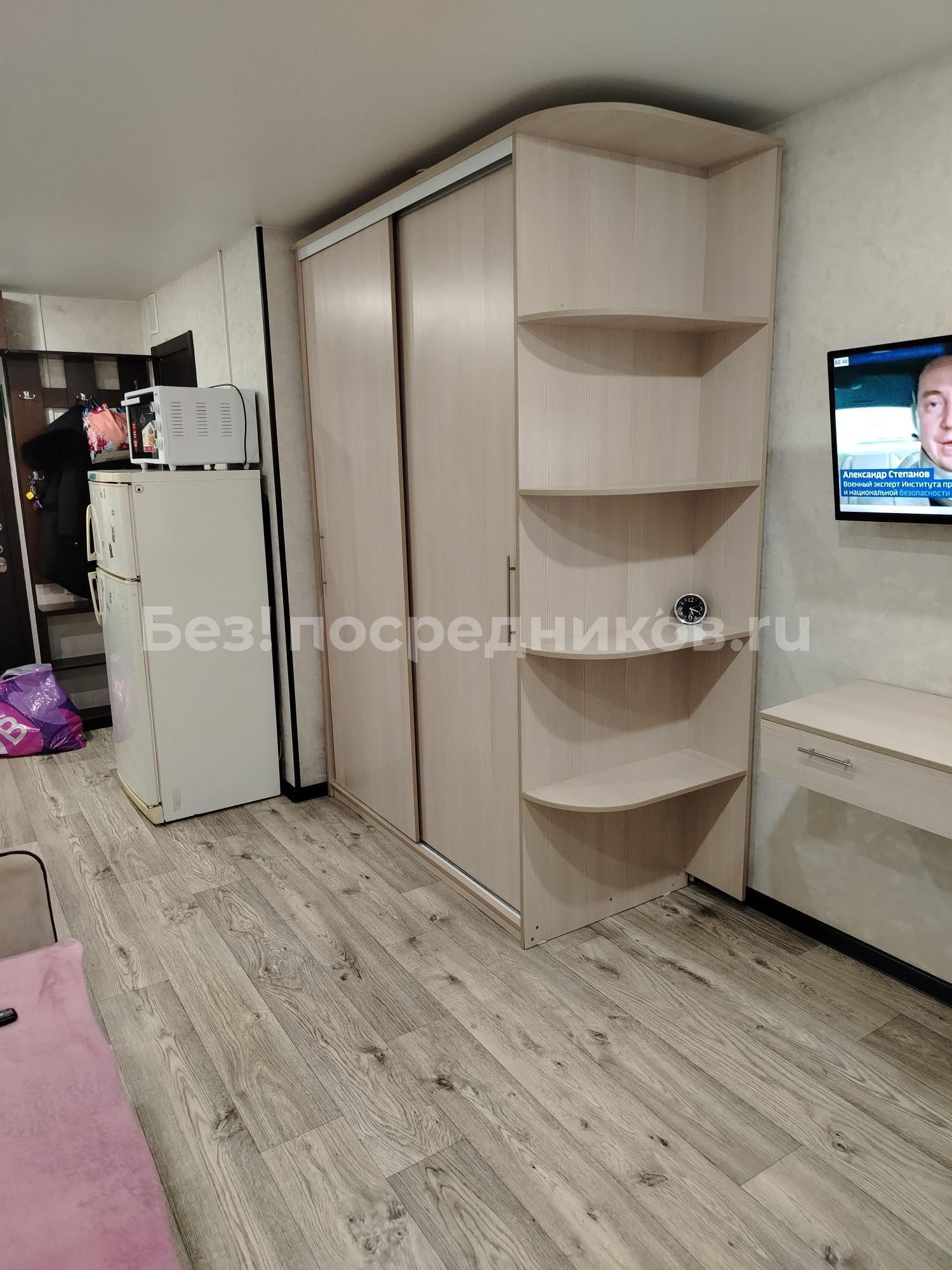 Из мебели: встроенный шкаф в комнате, кровать. Шкаф в прихожей. Столешница на кухне, стол, табуреты, шкафы кухонные, микроволновка, утюг, 2 комплекта постельного белья.
