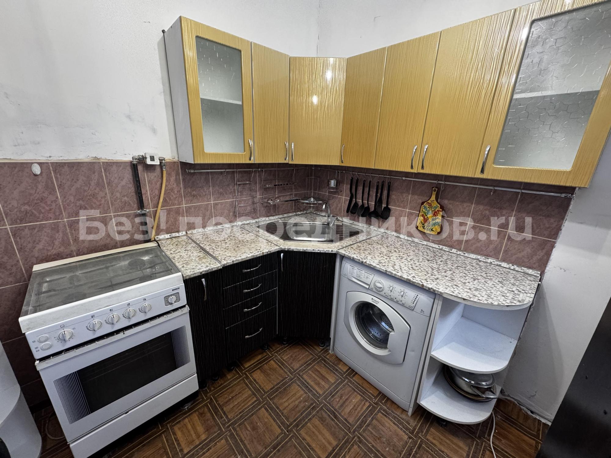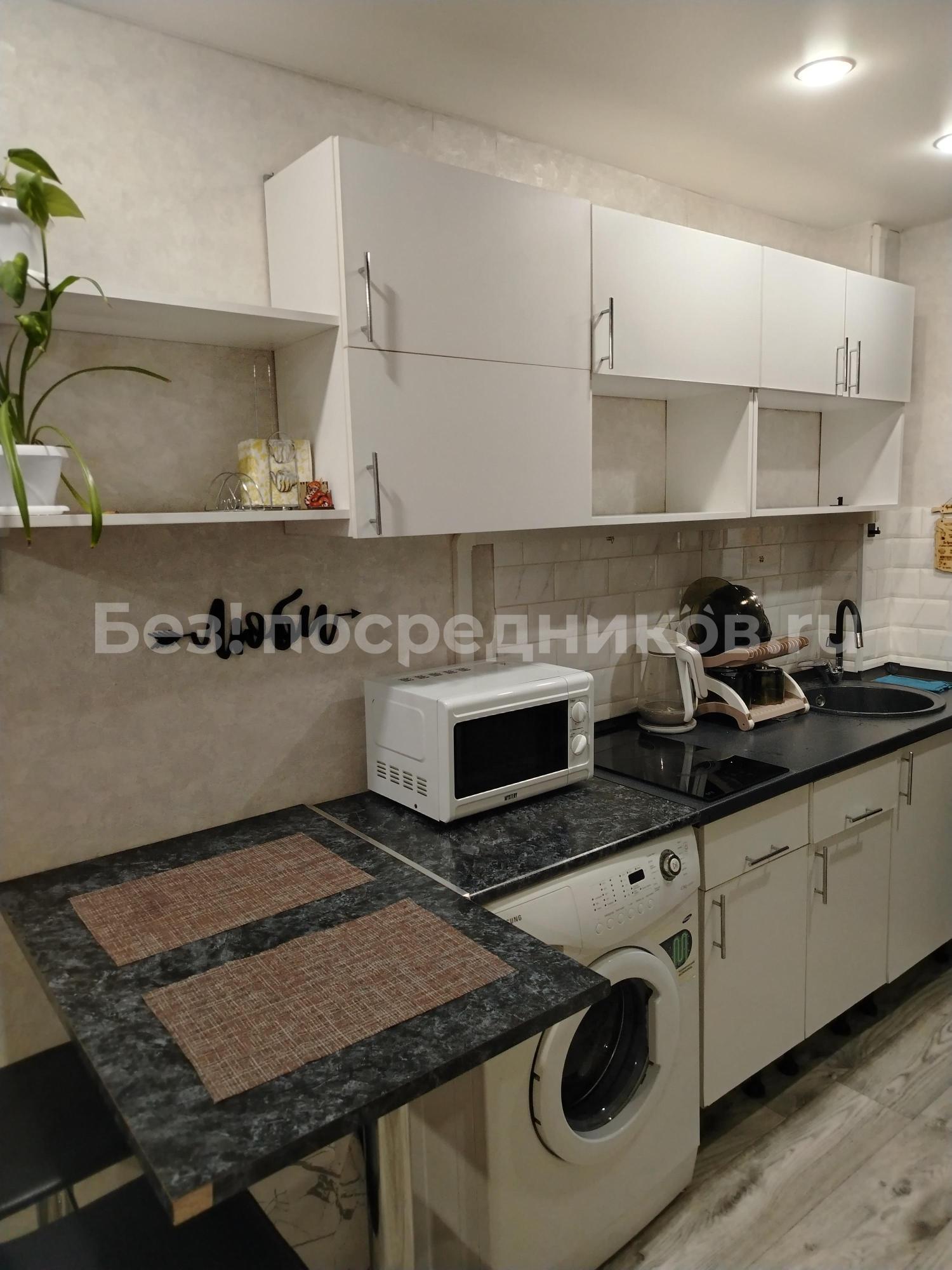 В квартире есть кухонный гарнитур, стол, стулья, двуспальная кровать, односпальная кровать, шкафы, телевизор, тумба, холодильник, эл.плита, микроволновая печь, эл. чайник, стиральная машина, постельное белье, полотенца,посуда, утюг, гладильная доска, сушка.