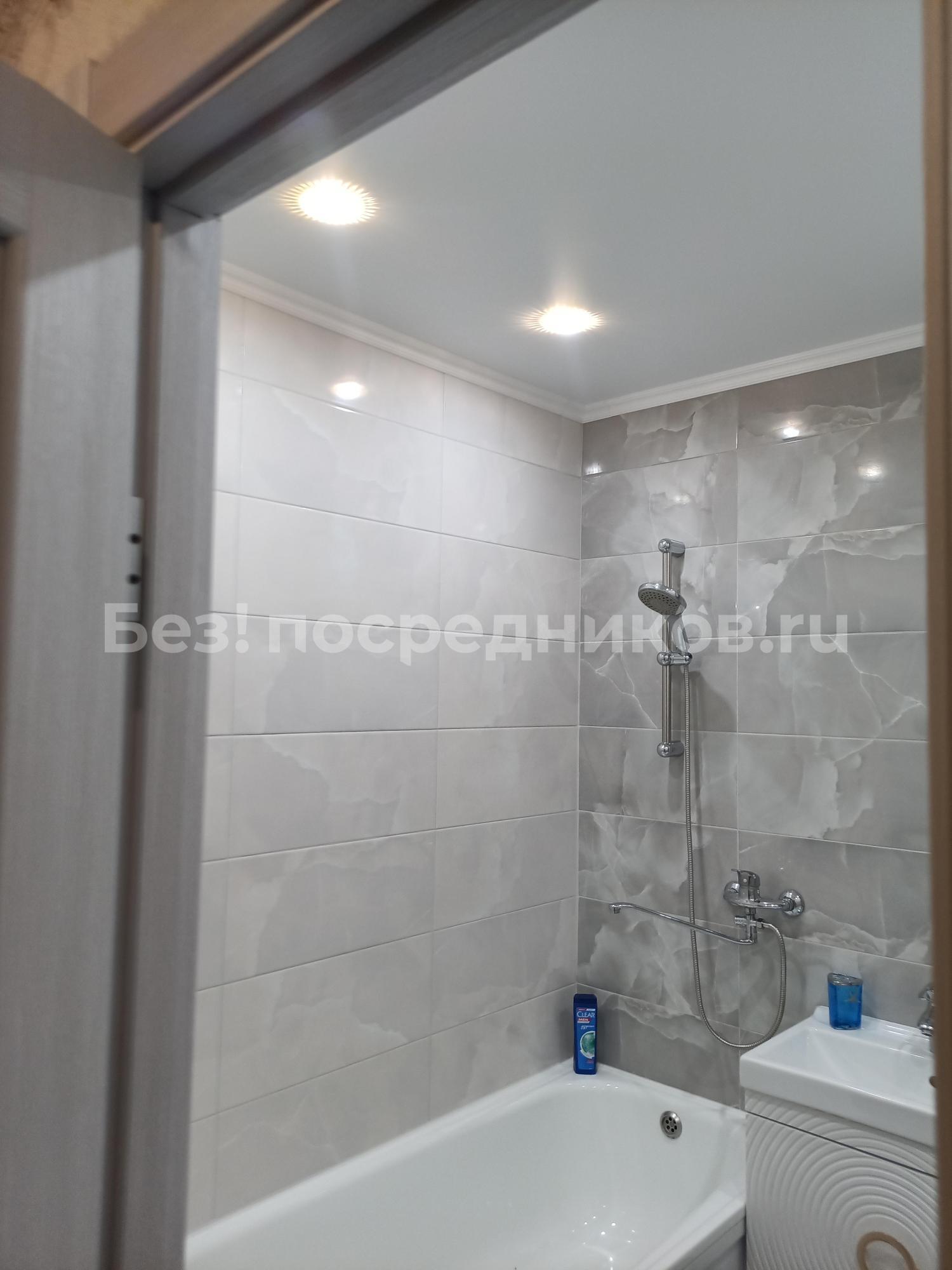 Санузел совмещен и выложен плиткой. Во всей квартире натяжные потолки.
