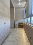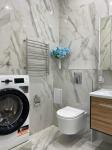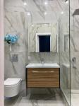Кухня оборудована современной техникой и стильной мебелью, включая встроенный холодильник и духовой шкаф. Санузел совмещенный, выполнен в темных тонах с качественной сантехникой.