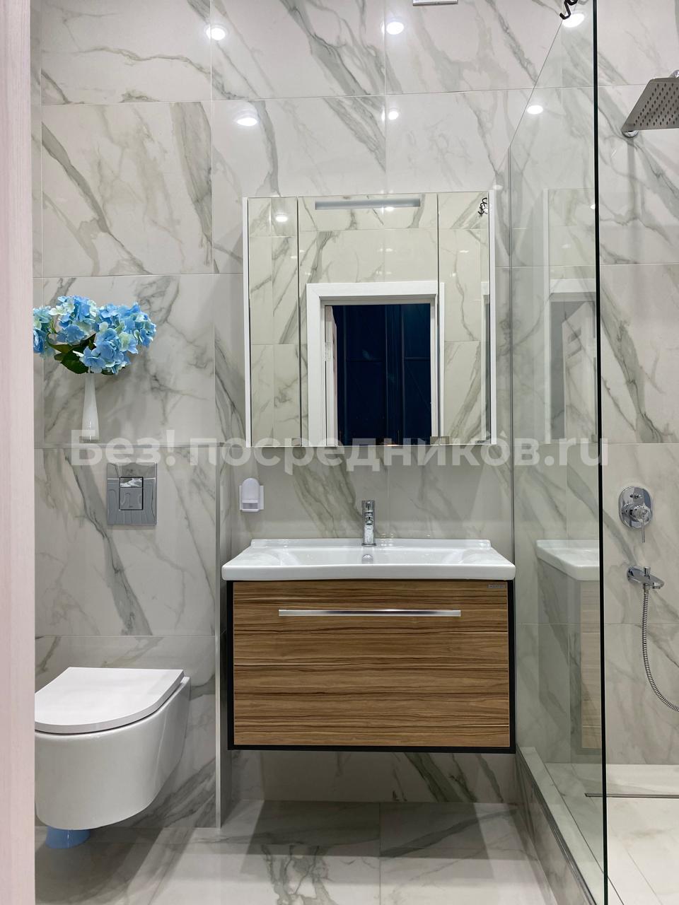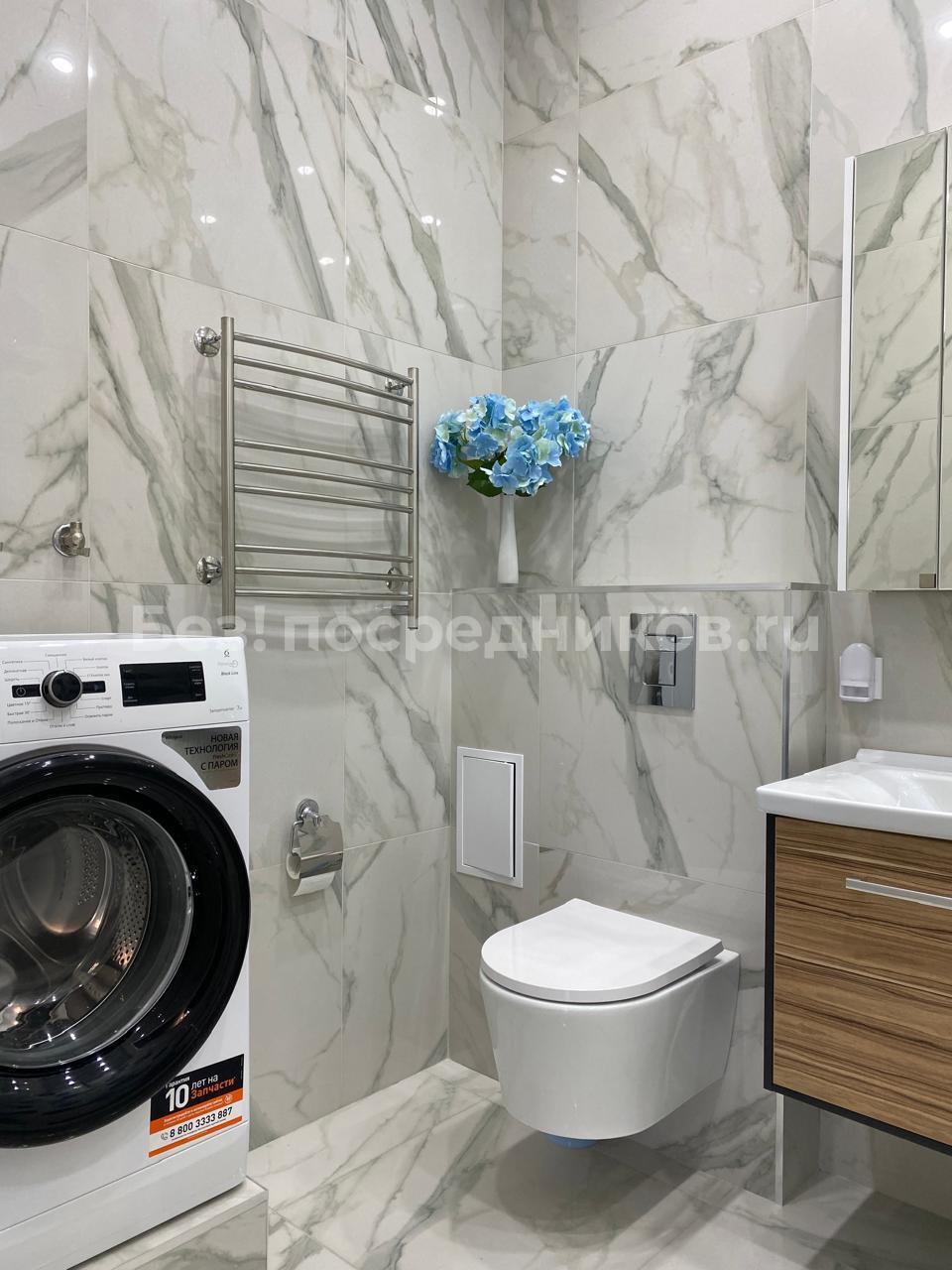 + Санузел 4,8 кв.м. с качественным ремонтом, встроенной вытяжкой, большой угловой ванной, водонагревателем скрытым в потайном шкафу над стиральной машиной для хранения моющих средств.