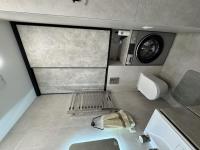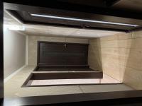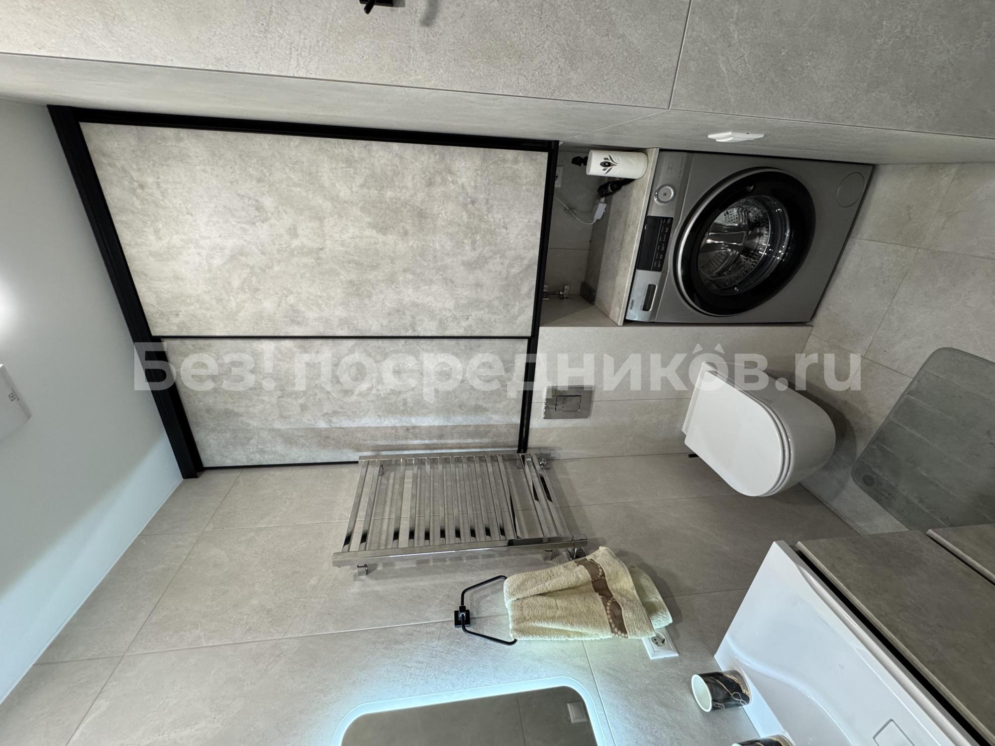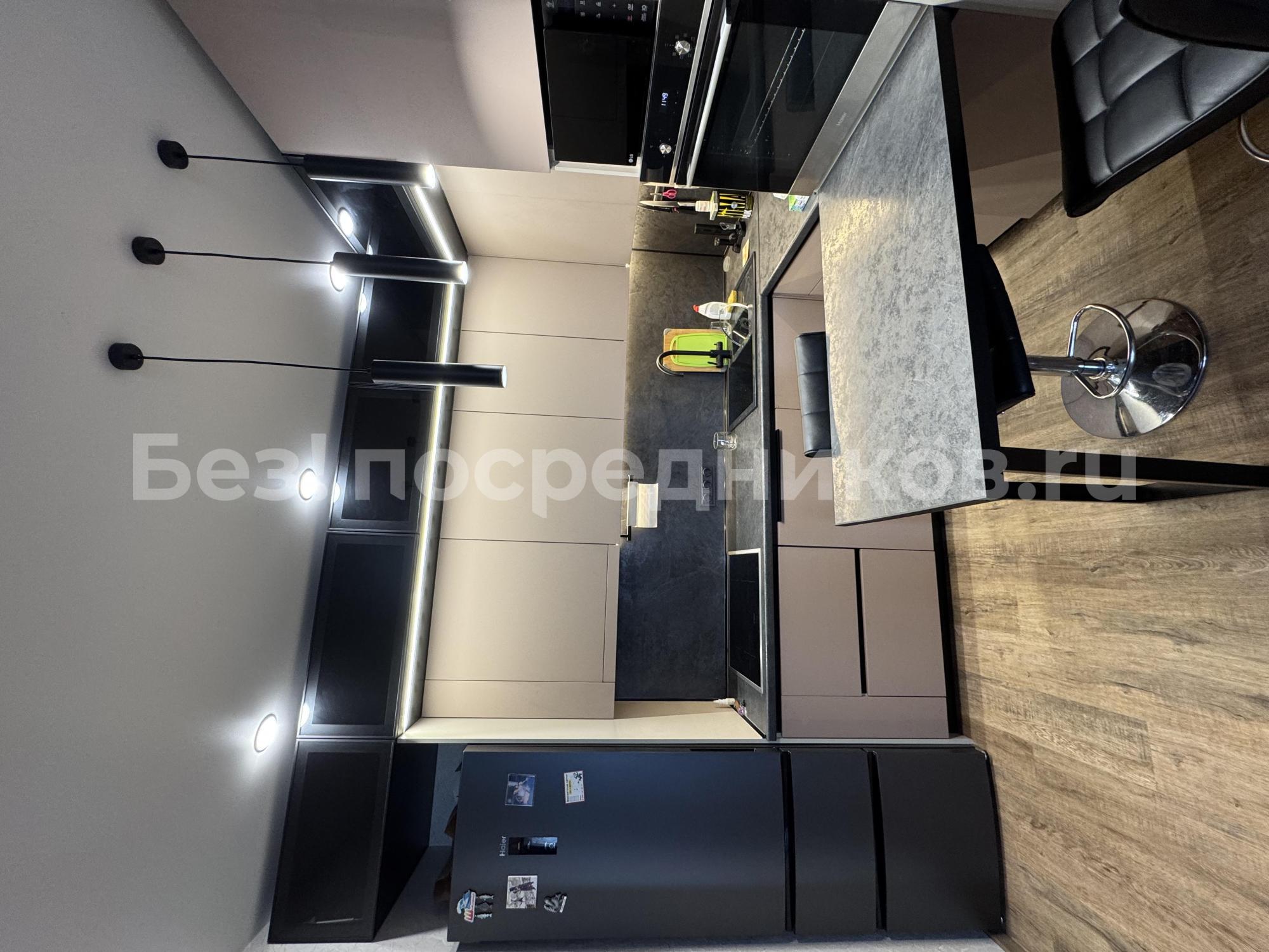 Кухня оборудована современной техникой и стильной мебелью, включая встроенный холодильник и духовой шкаф. Санузел совмещенный, выполнен в темных тонах с качественной сантехникой.