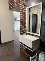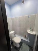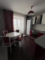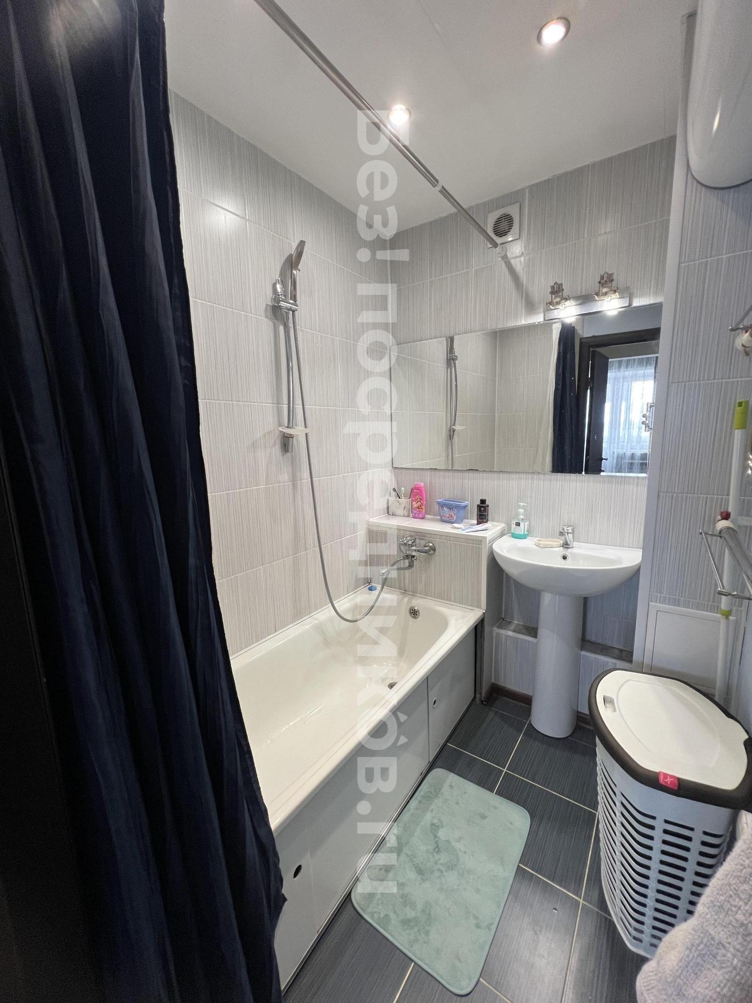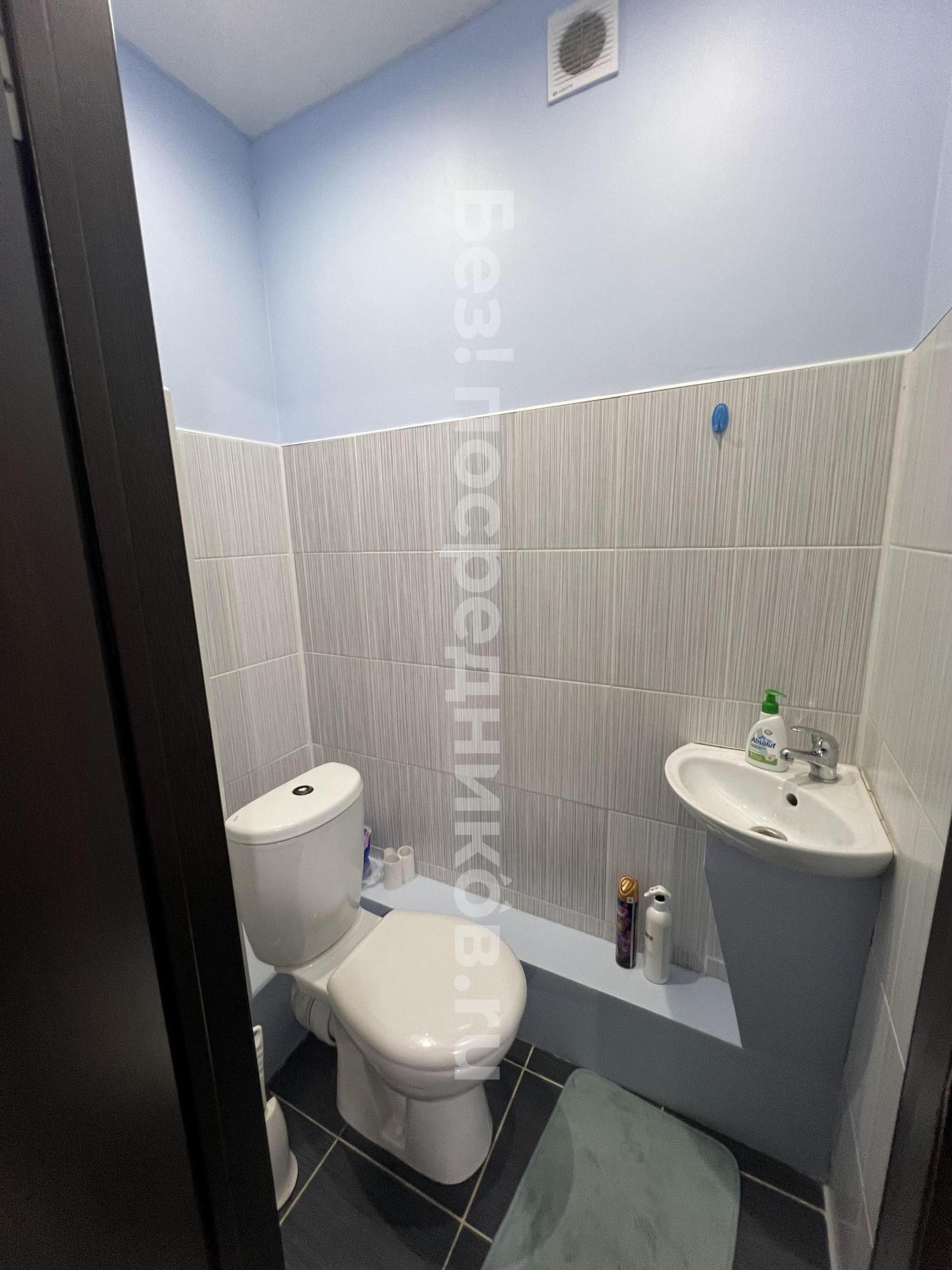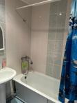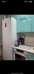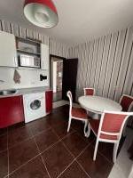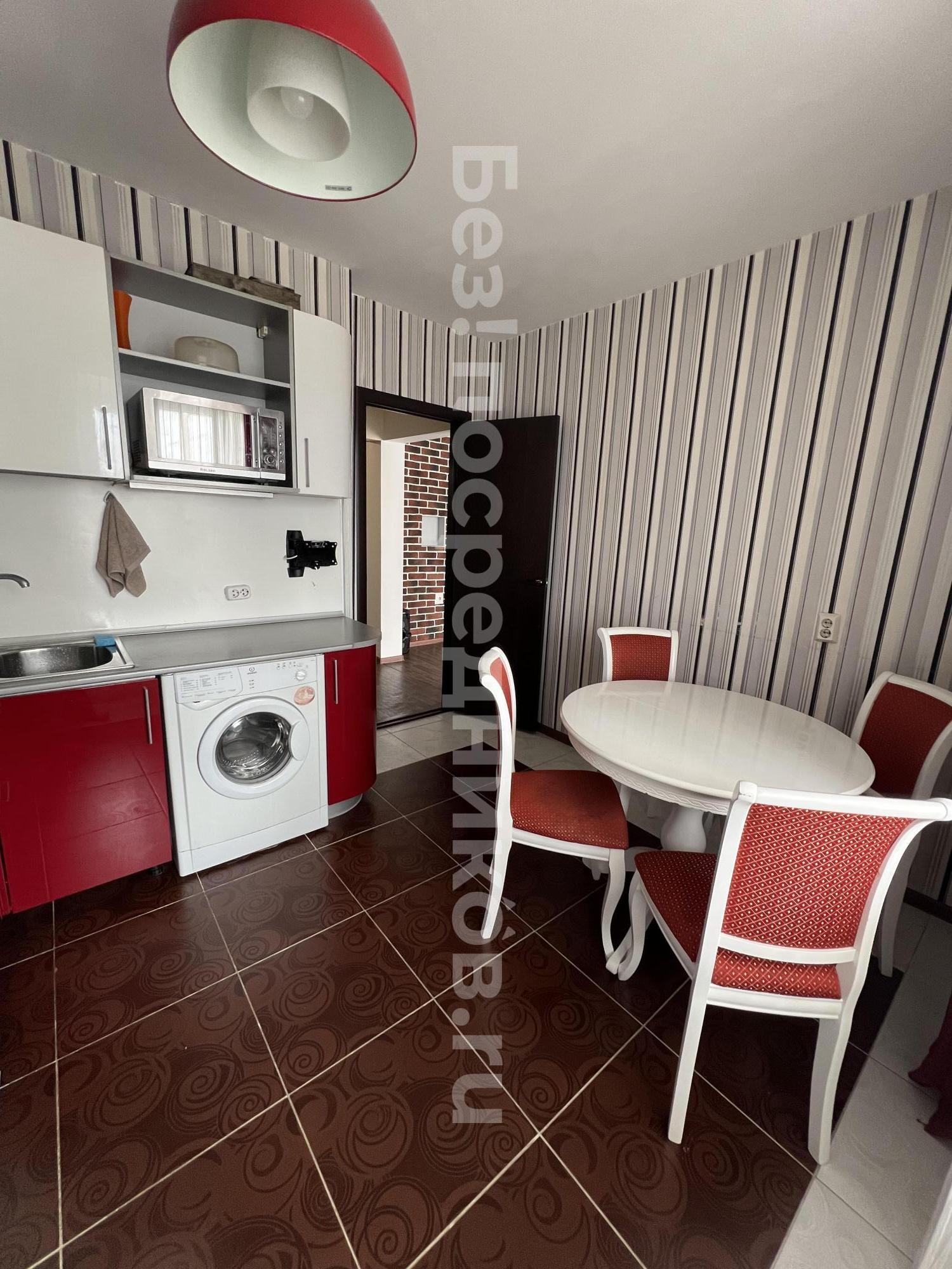 Кухня просторная, оснащена необходимой бытовой техникой, включая холодильник и стиральную машину. Из мебели есть шкафы и обеденный стол. Сдается вместе с мебелью, фото соответствуют. Ванная комната и туалет раздельные, оформлены в современном стиле.
