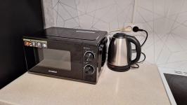 Из электроники: плита с духовкой, микроволновая печь, холодильник, чайник, вытяжка, телевизор, фен, утюг, робот-пылесос, стиральная машина.