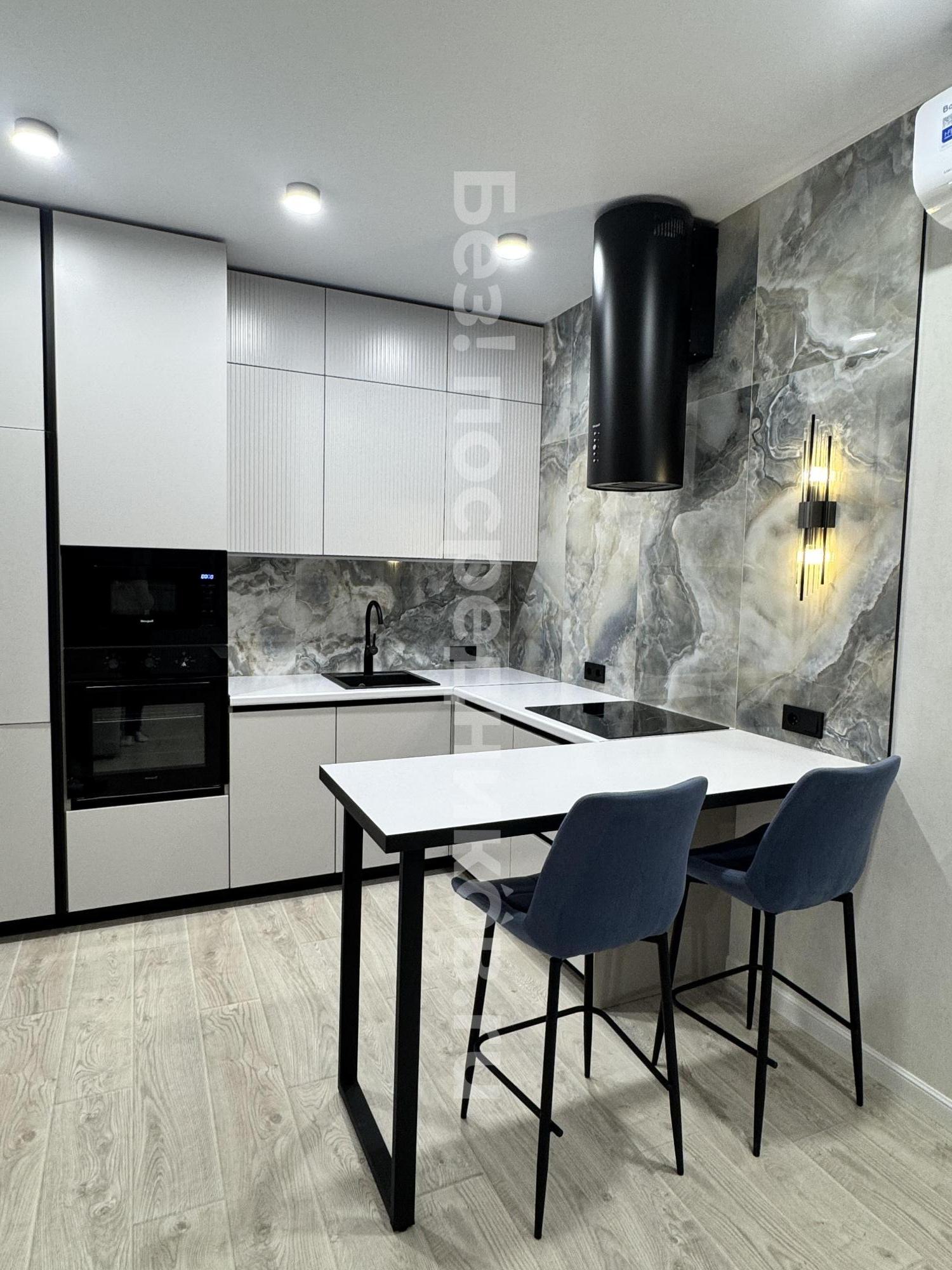 Всё новое . Белый кухонный гарнитур, холодильник, встроенная плита , вытяжка, белый стол+ стулья, диван, белая глянцевая тумба ТВ, белый глянцевый шкаф для одежды. Натяжные потолки со встроенными светильниками. Зеркало в ванной с подсветкой.Стиральная машина. На полу , во всей квартире и на лоджии уложен белый с серыми разводами, керамогранит. Квартира очень светлая.