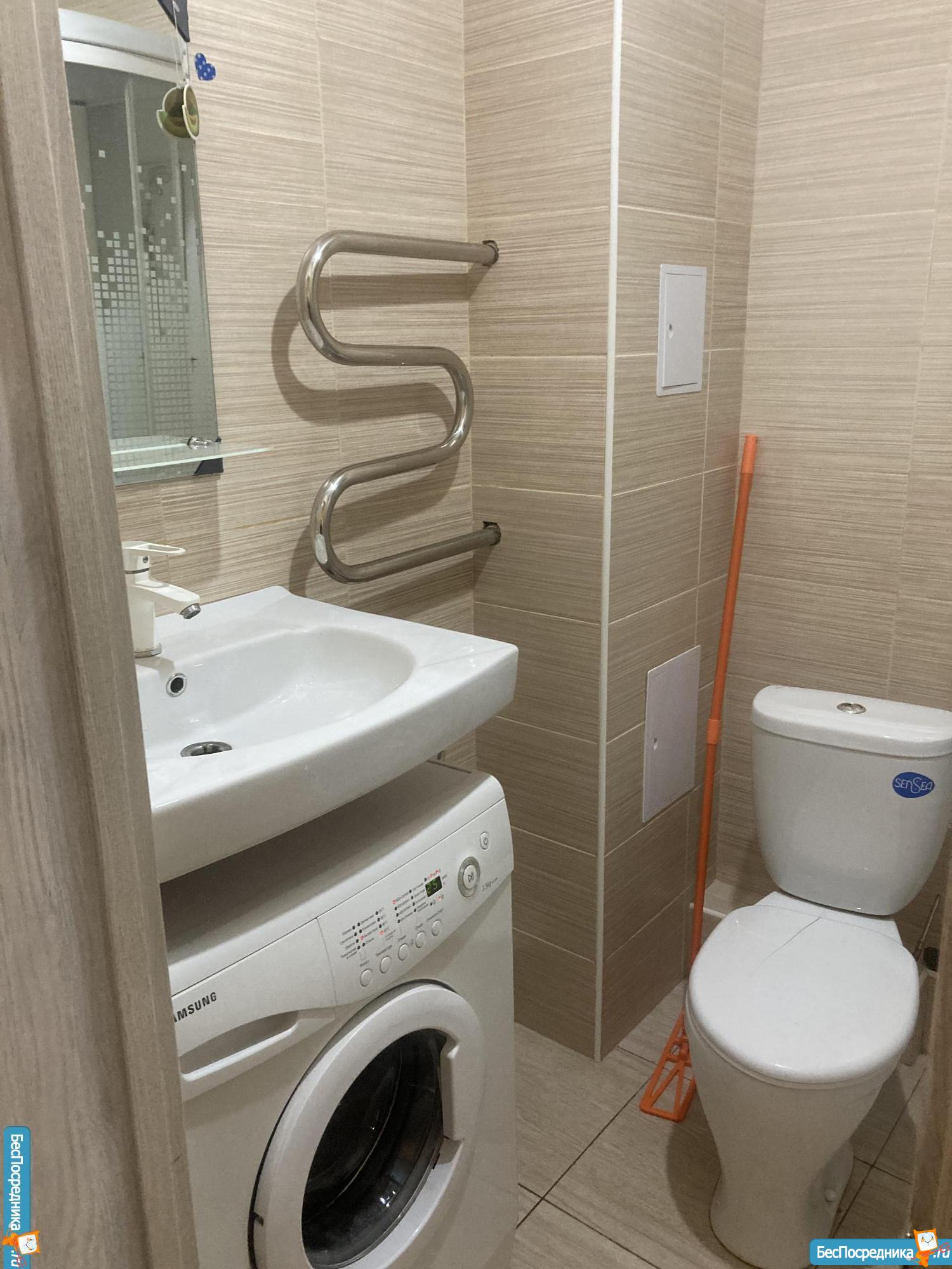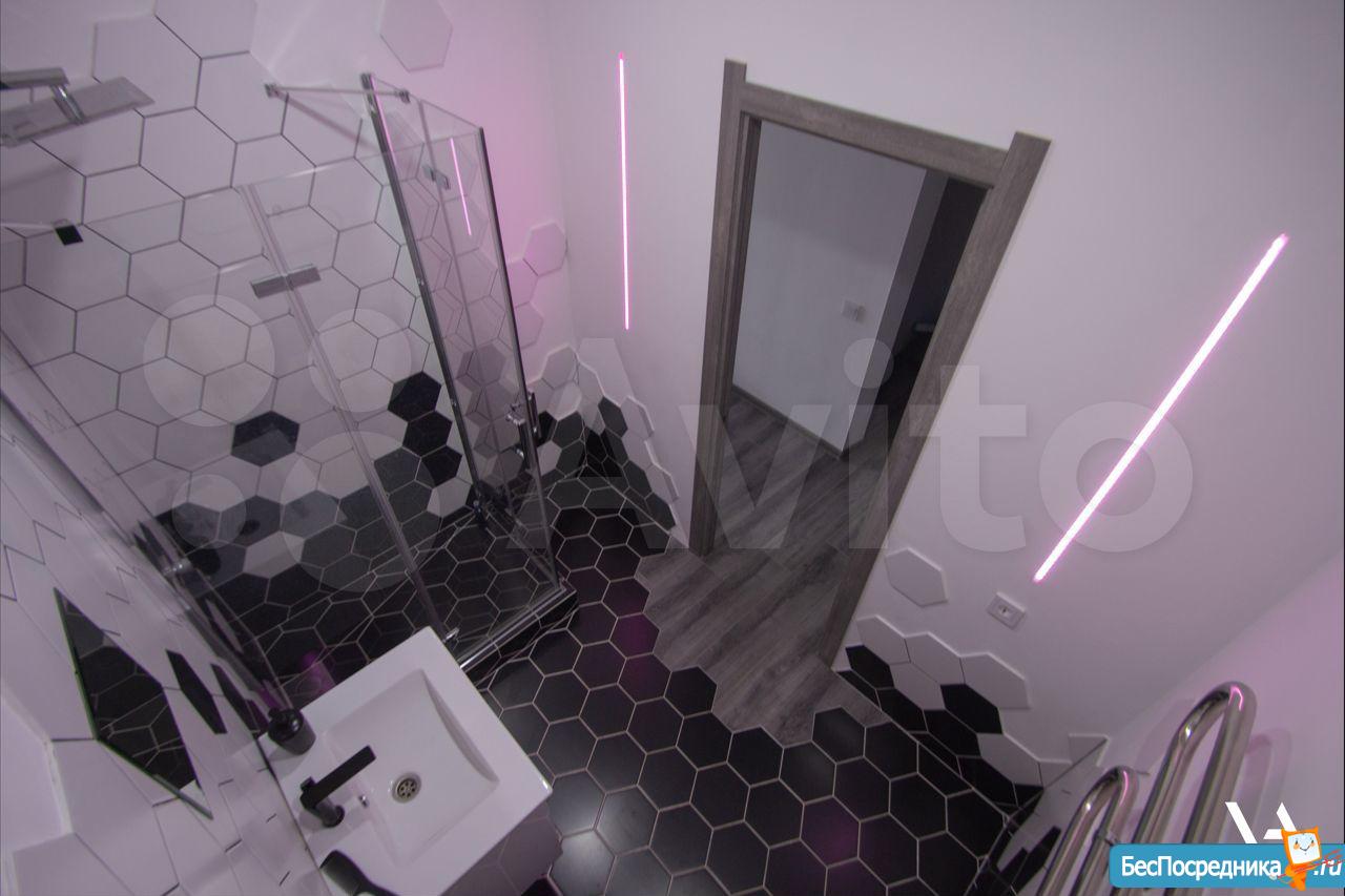 Есть все необходимое - мебель, диван, рабочий стол, стулья, микроволновка, плита, холодильник, стиралка. На лоджии - теплый пол. Тропический душ, RGB подсветка, Кухонный фартук с эффектом "меловой доски", Инсталляция.