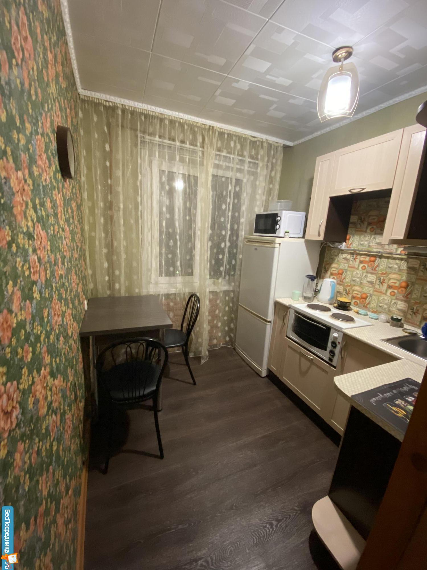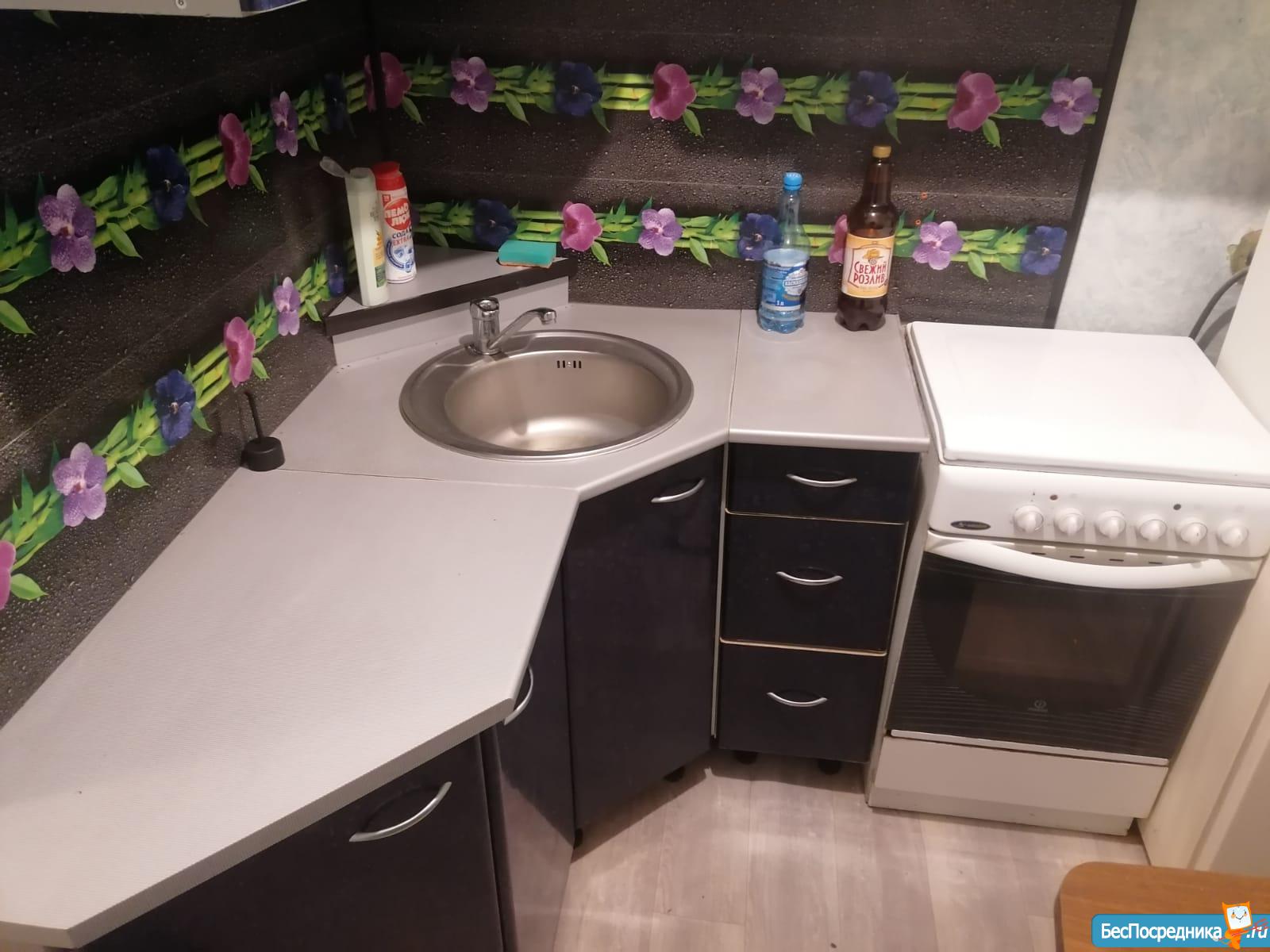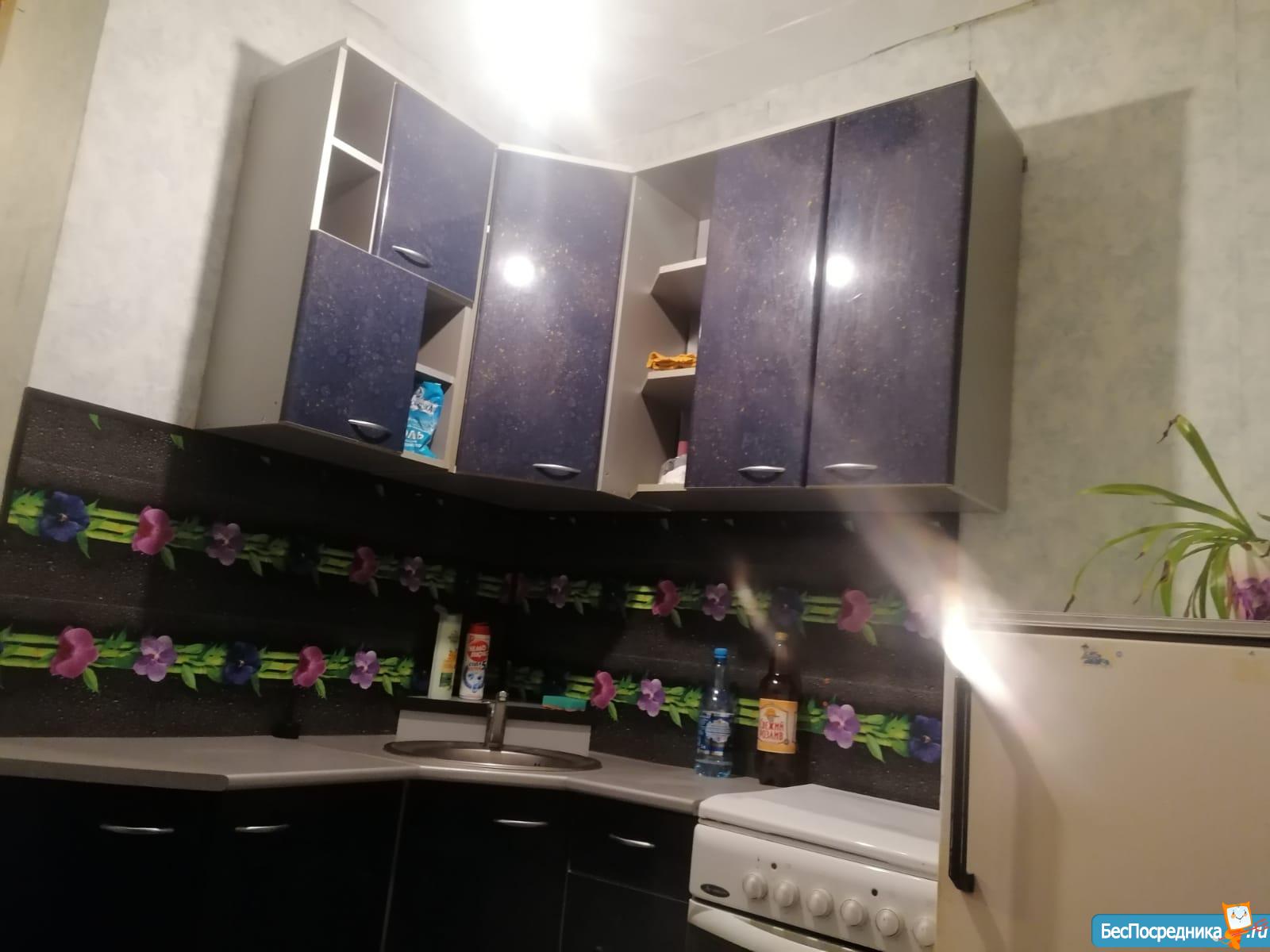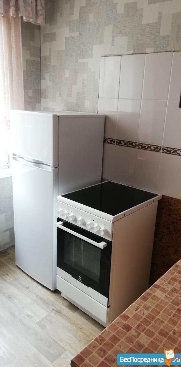 В квартире имеется угловой диван, вместительный шкаф-стенка, холодильник, стиральная машина, чайник, электроплита, окна пластиковые.