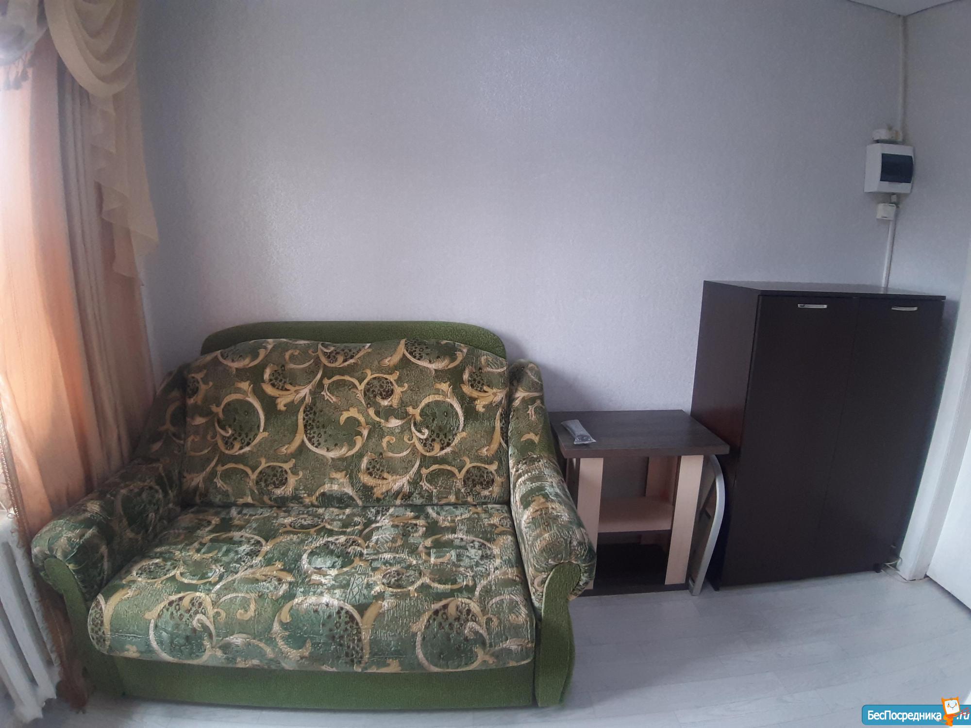 Есть шкаф, диван, стол, холодильник, плитка, кондиционер. Цена 17000 +свет, вода