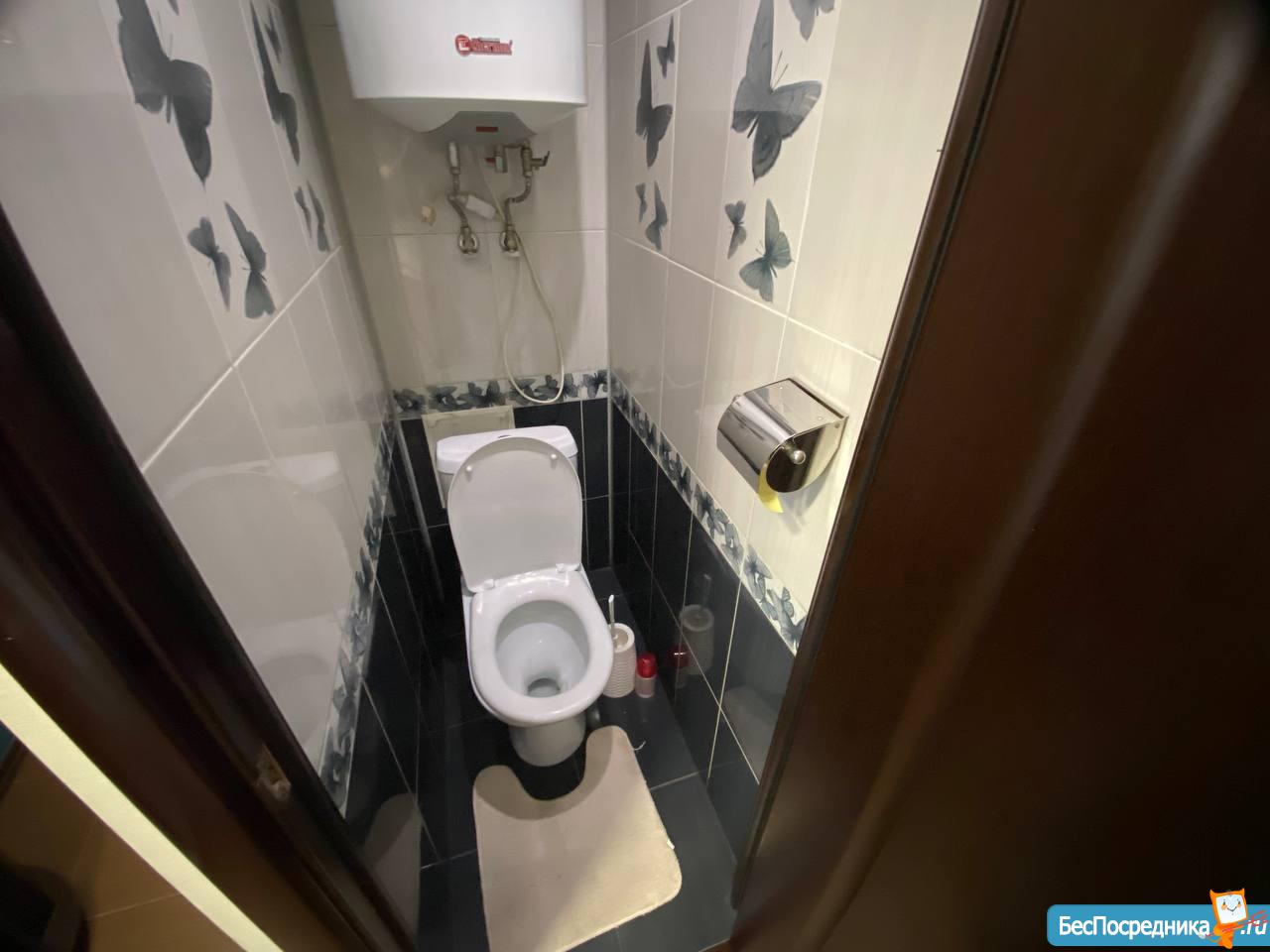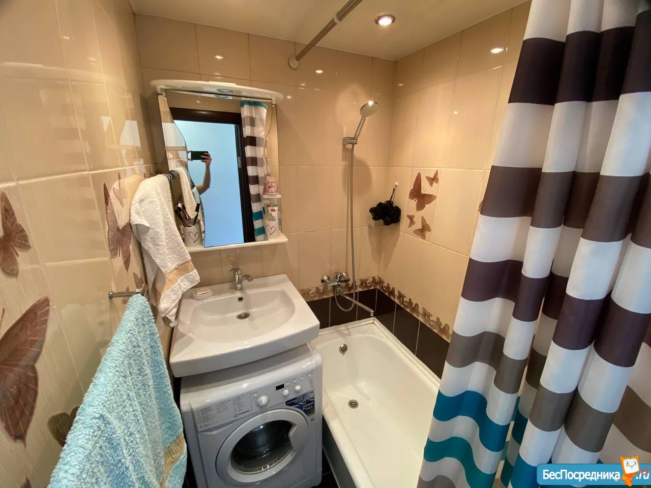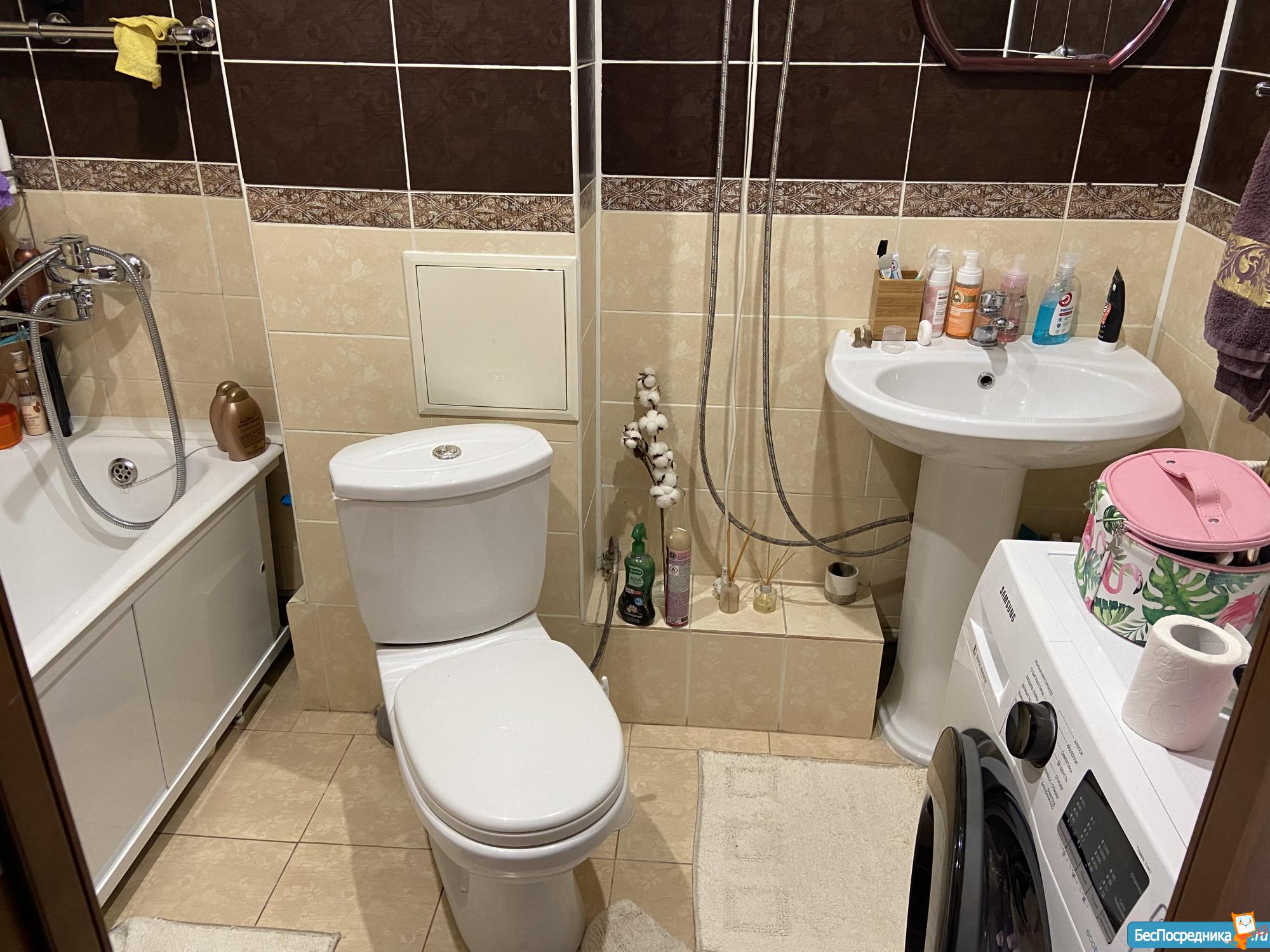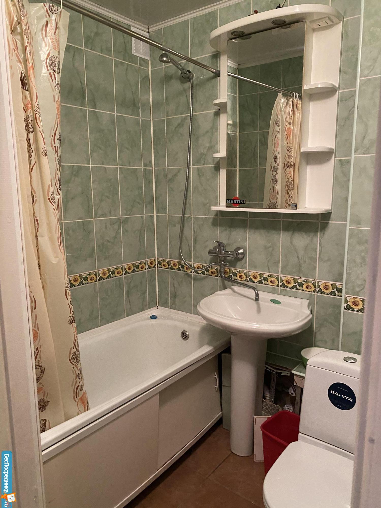 ВАННАЯ и ТУАЛЕТ раздельные. Туалет маленький. Водонагреватель - очень помогает в сезон летних отключений. Кафель на стенах и полу. В ванной комнате: стиральная машина Indesit, ванная, раковина, шкаф с полками и зеркалом.