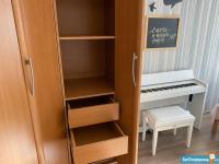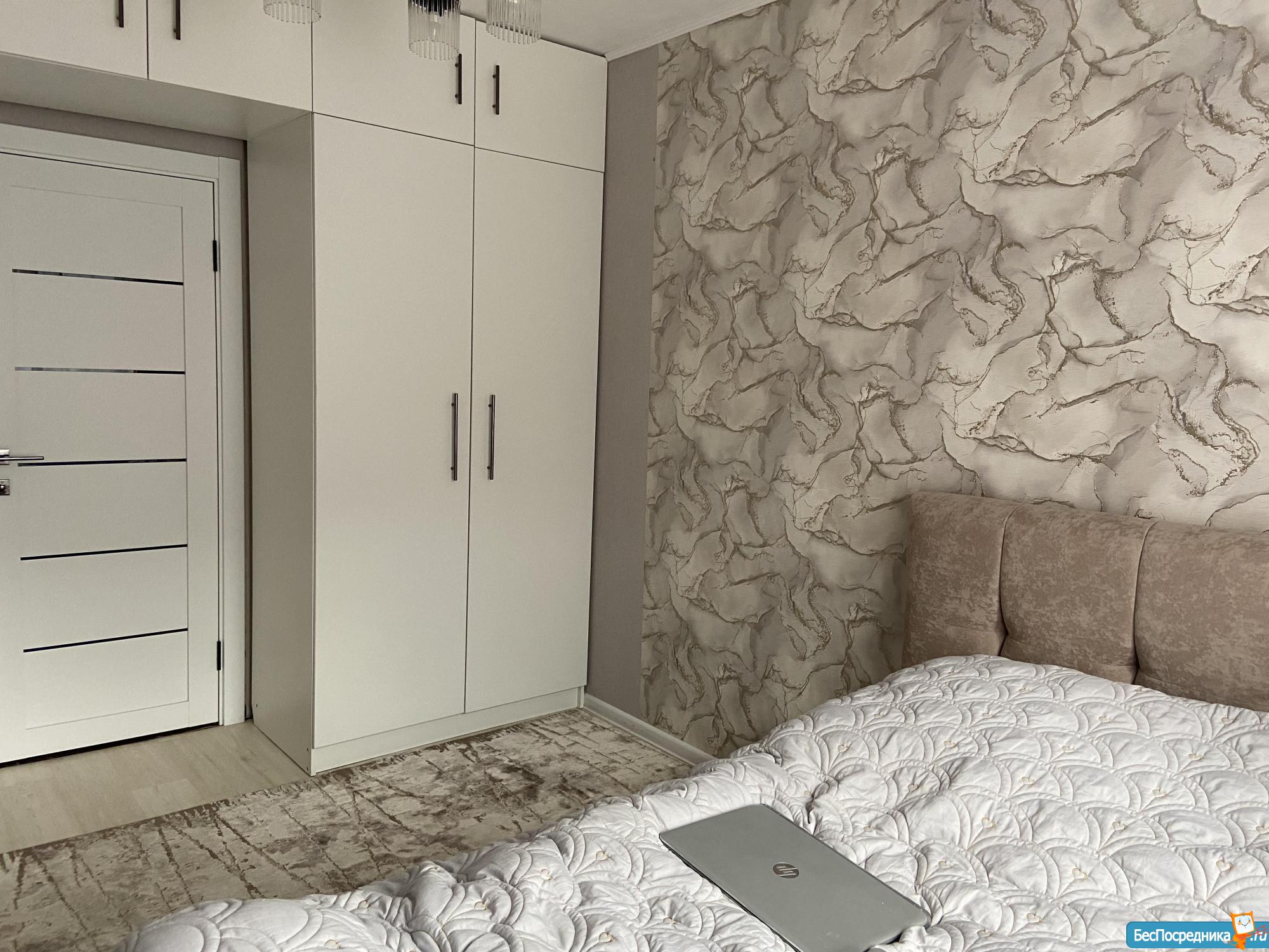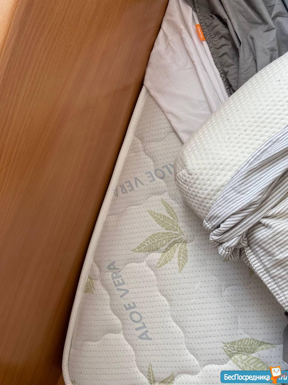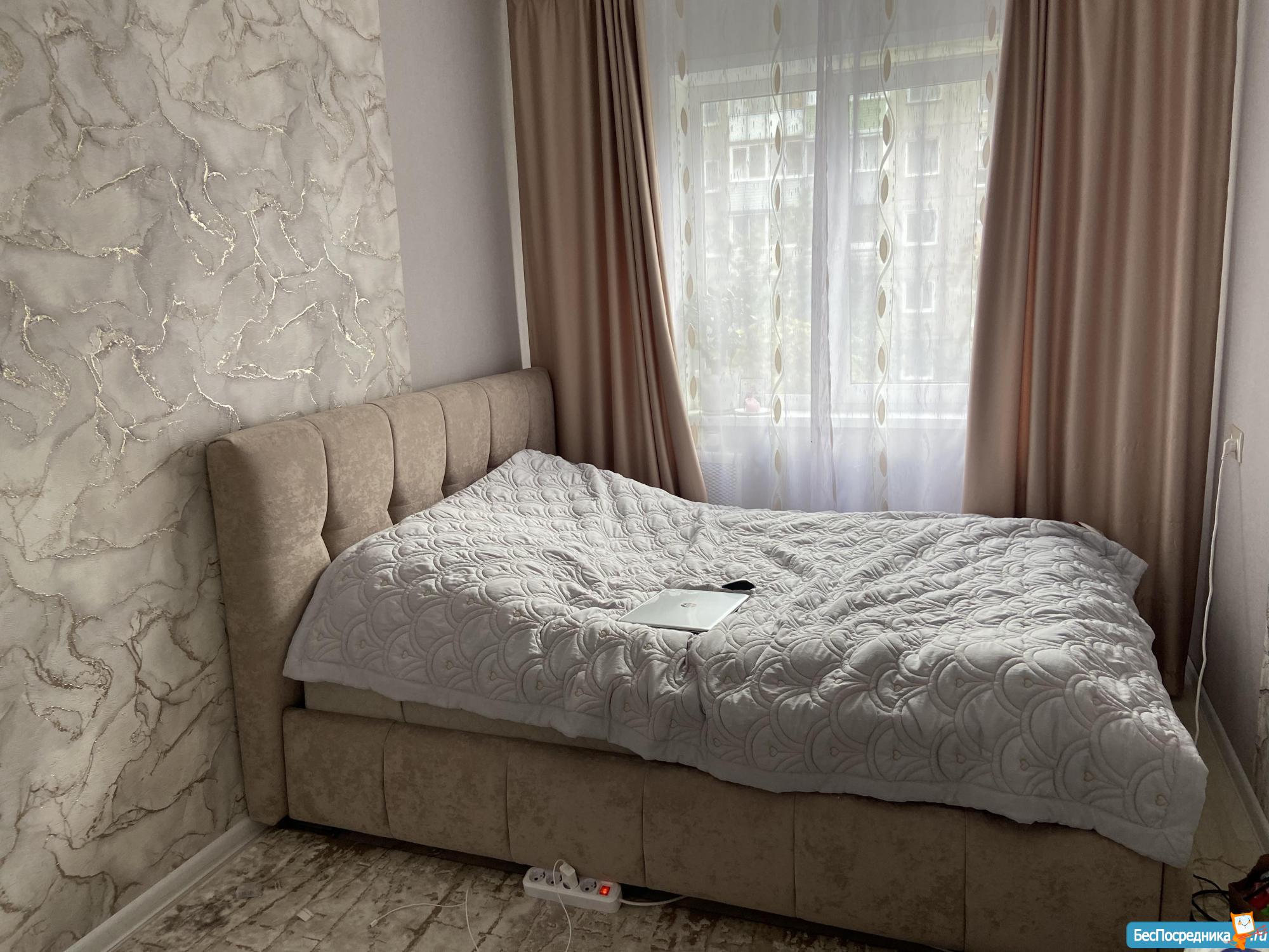 КОМНАТА 2: двуспальная кровать, матрац ортопедический ОРМАТЕК, подушка 1 ортопедическая, 1 перьевая, большое одеяло, покрывало, запасной комплект постельного белья б/у. На окнах обычные шторы + рулонные блэк-ауты. Очень большой угловой шкаф с полками, ящиками и вешалками. Тумбы прикроватные. Комод на 3 вместительных ящика. Оставим на стене рамки под ваши фотографии и доску для надписей мелом.
