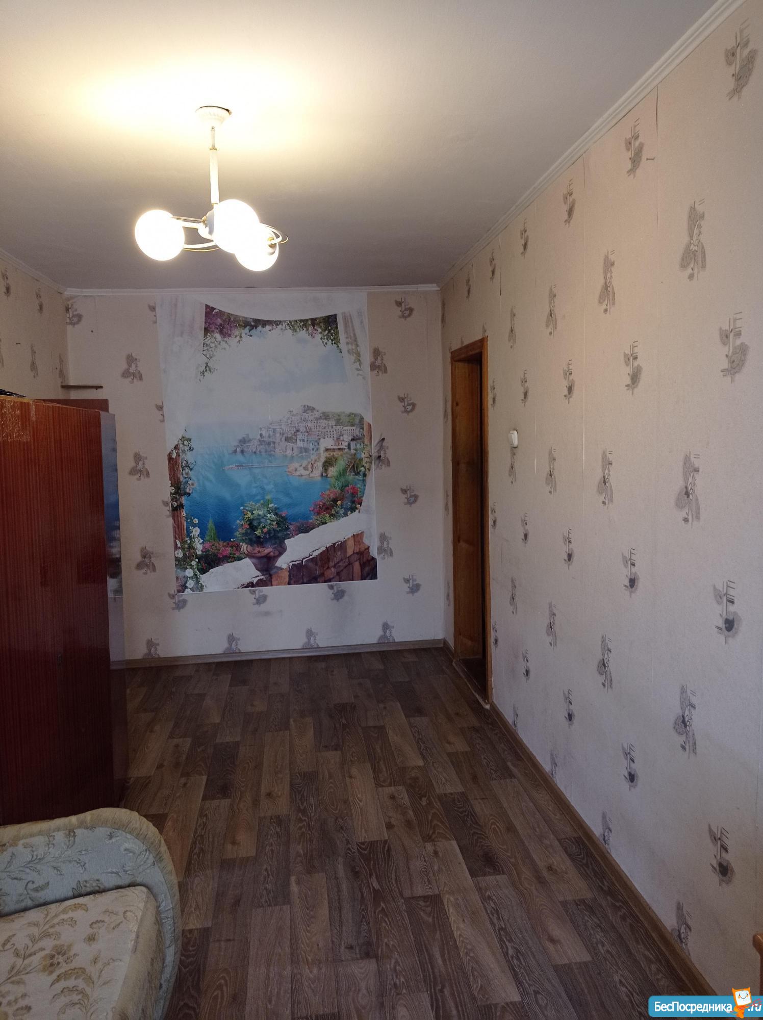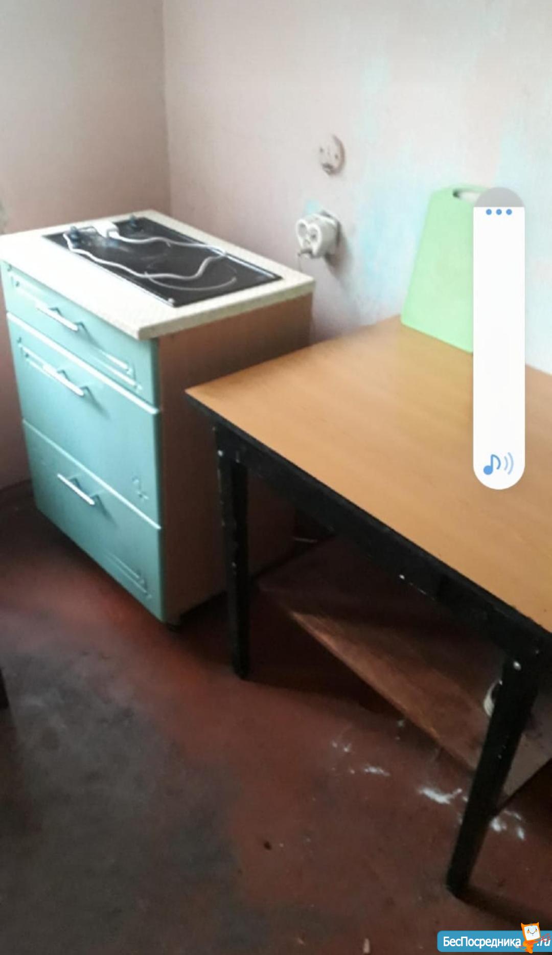 Комната в обычном состоянии. Выход на лоджию и окно в пластике. Лоджия застеклена. В комнате шкаф,диван,столик. На кухне стол,плитка.Имеется тамбур отдельно от общего коридора.В оплату входят все коммунальные услуги.