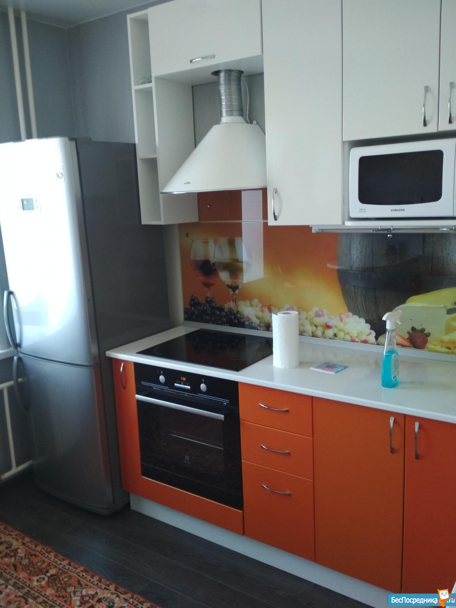 В квартире есть холодильник, плита с духовка, просторный шкаф-купе, стеллажи для хранения вещей, кухонный гарнитур, диван, кровать 2спальная, кухонные стол и стулья. Закрытая территория дома, огорожена забором, во дворе собственная парковка со шлакбаумом.