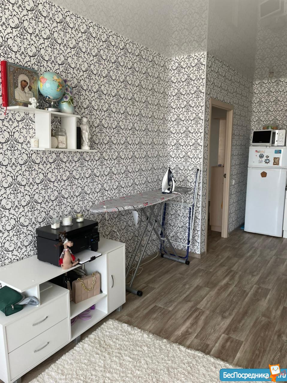 Есть: кровать с матрасом, кухонный гарнитур, шторы, прихожая, небольшой холодильник, микроволновка, чайник, мультиварка, плитка, водонагреватель (всё что на фото).