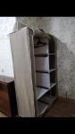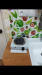 В комнате вода, вся бытовая техника (холодильник, стиралка, микроволновка, чайник, плитка). Мебель: двуспальный диван, кухонный гарнитур, стулья, шкафы.