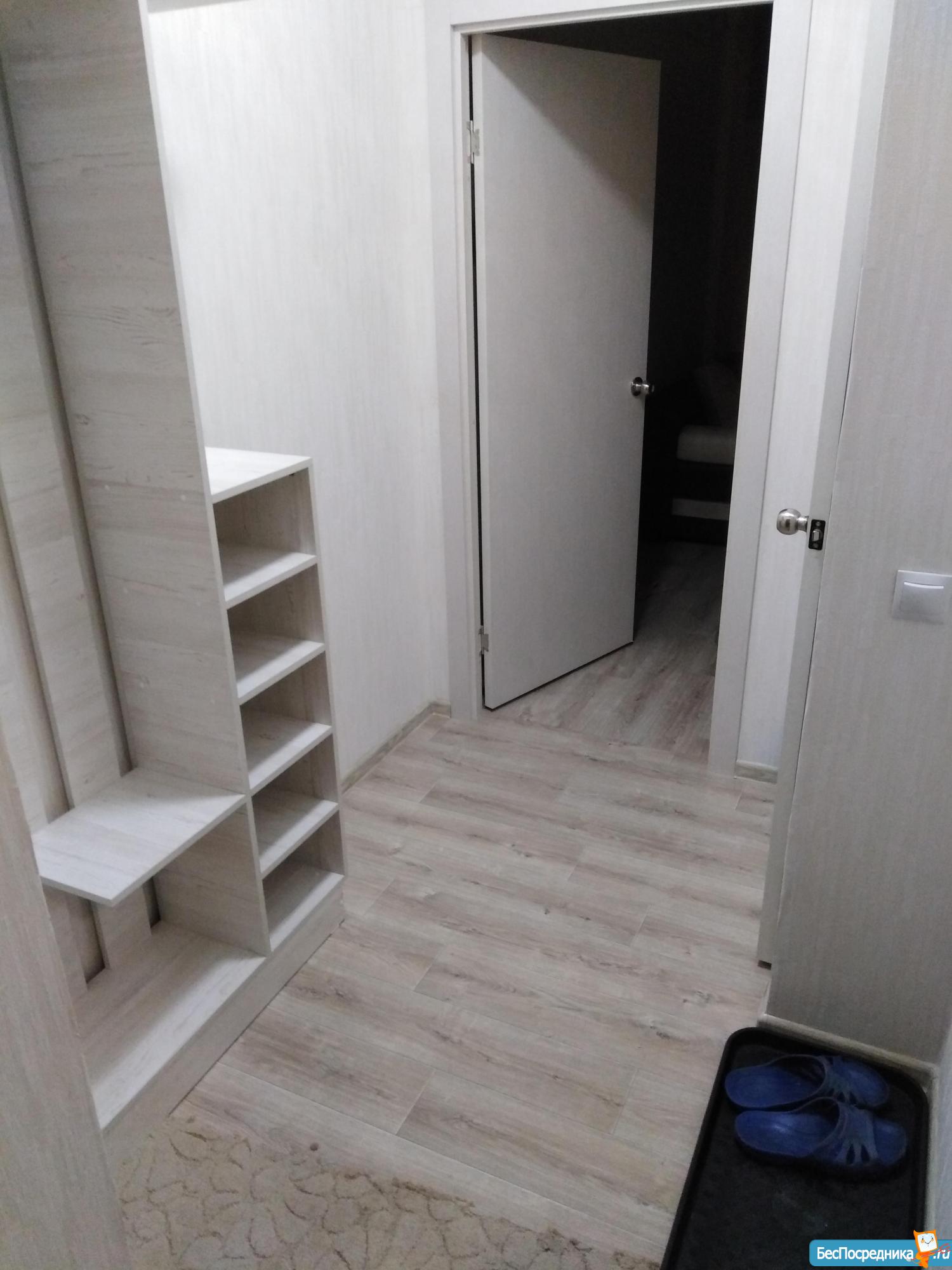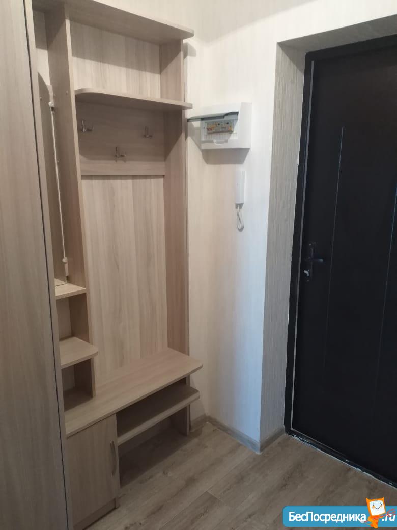 Диван еврокнижка ,вместительная стенка ,холодильник,стол ,стулья ,плитка для приготовления пищи ,мини гарнитур ,чайник эл.,стиральная машина ,в прихожей полка для обуви и для верхней одежды .