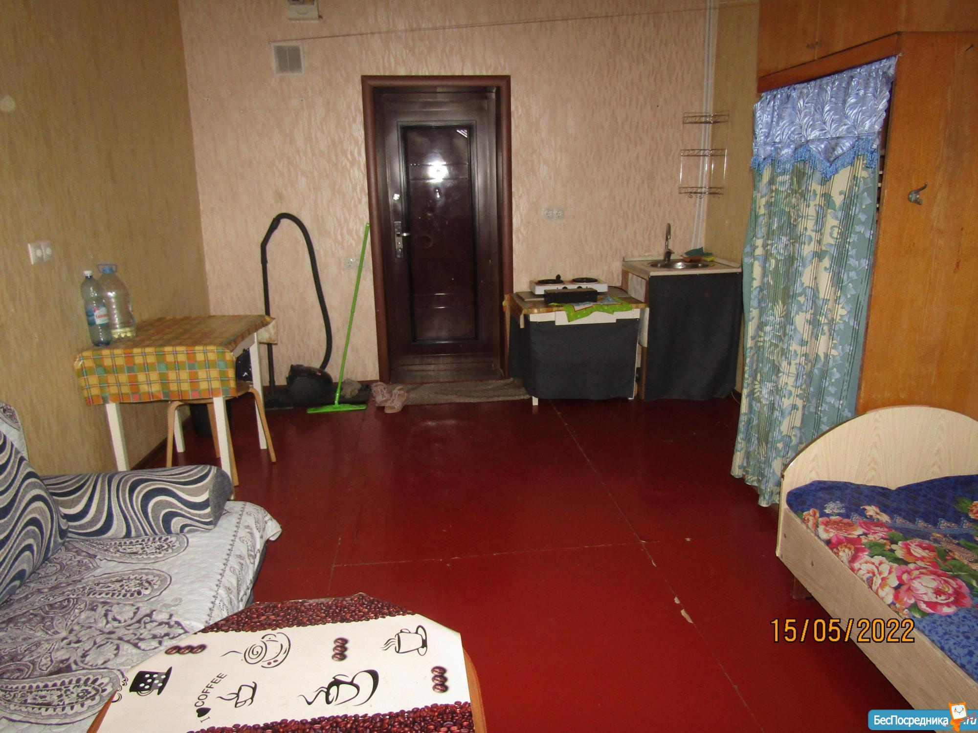 В комнате большой диван (2м*1.5м), в комнате есть ВОДОПРОВОД (горячая, холодная вода), возможность подключения стиральной машины. Комната, теплая не угловая, большая, просторная, чистая, окно пластиковое, новый радиатор, небольшая кровать, пылесос, плита, 2 стола, передвижной столик, трельяж , шкаф для вещей. Кухня, душ и туалет (2 шт.) общие на этаже, рядом с комнатой.