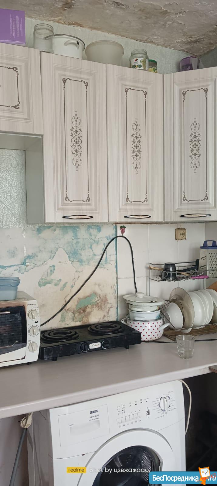 В кухне:кухонный гарнитур,машина стиральная,плита
