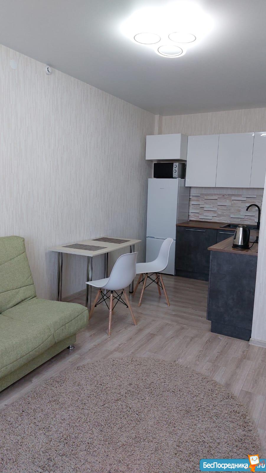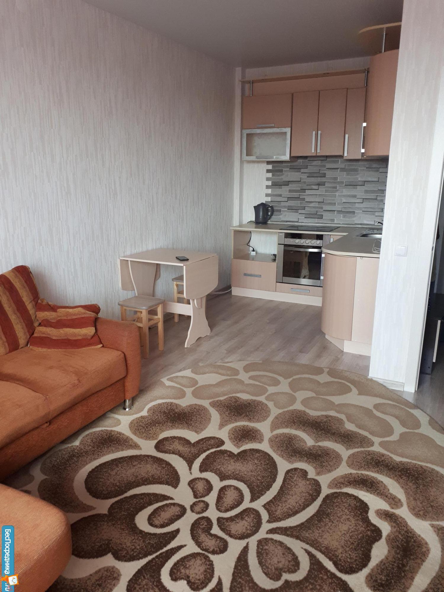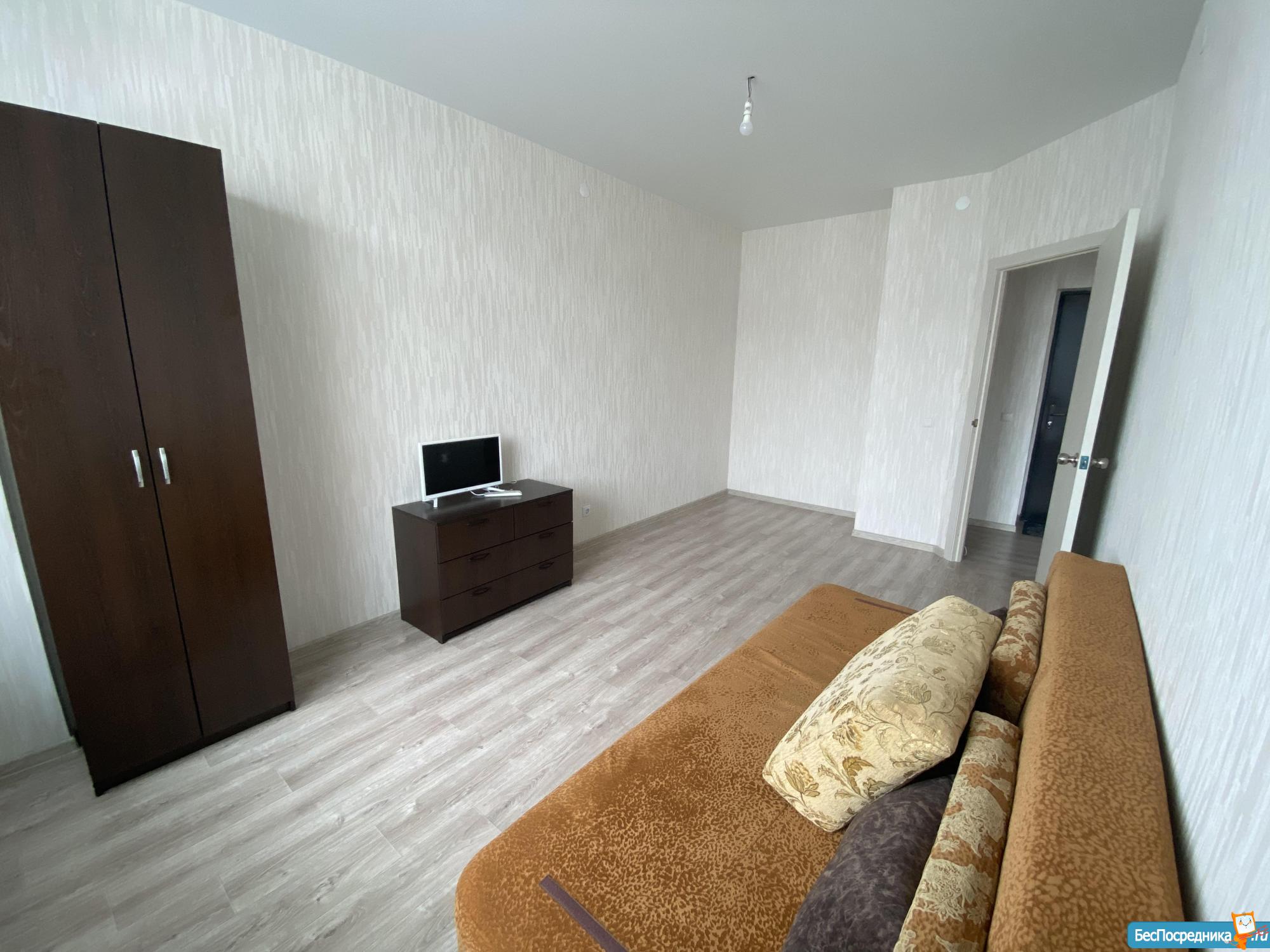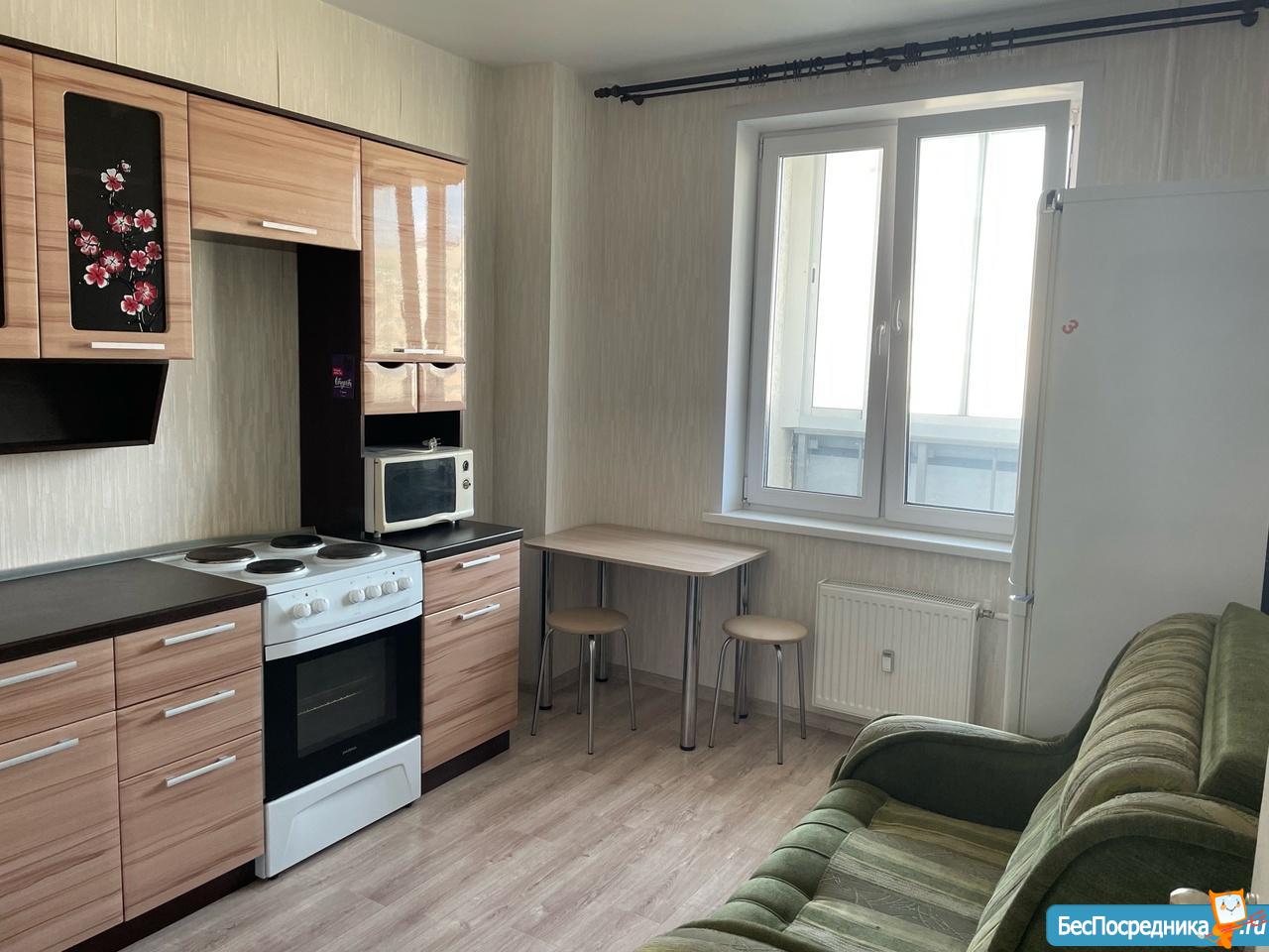 Однокомнатная квартира, в новом доме. В квартире, новый диван, стол, кухонный гарнитур, большой холодильник, микроволновка,стиральная машина.