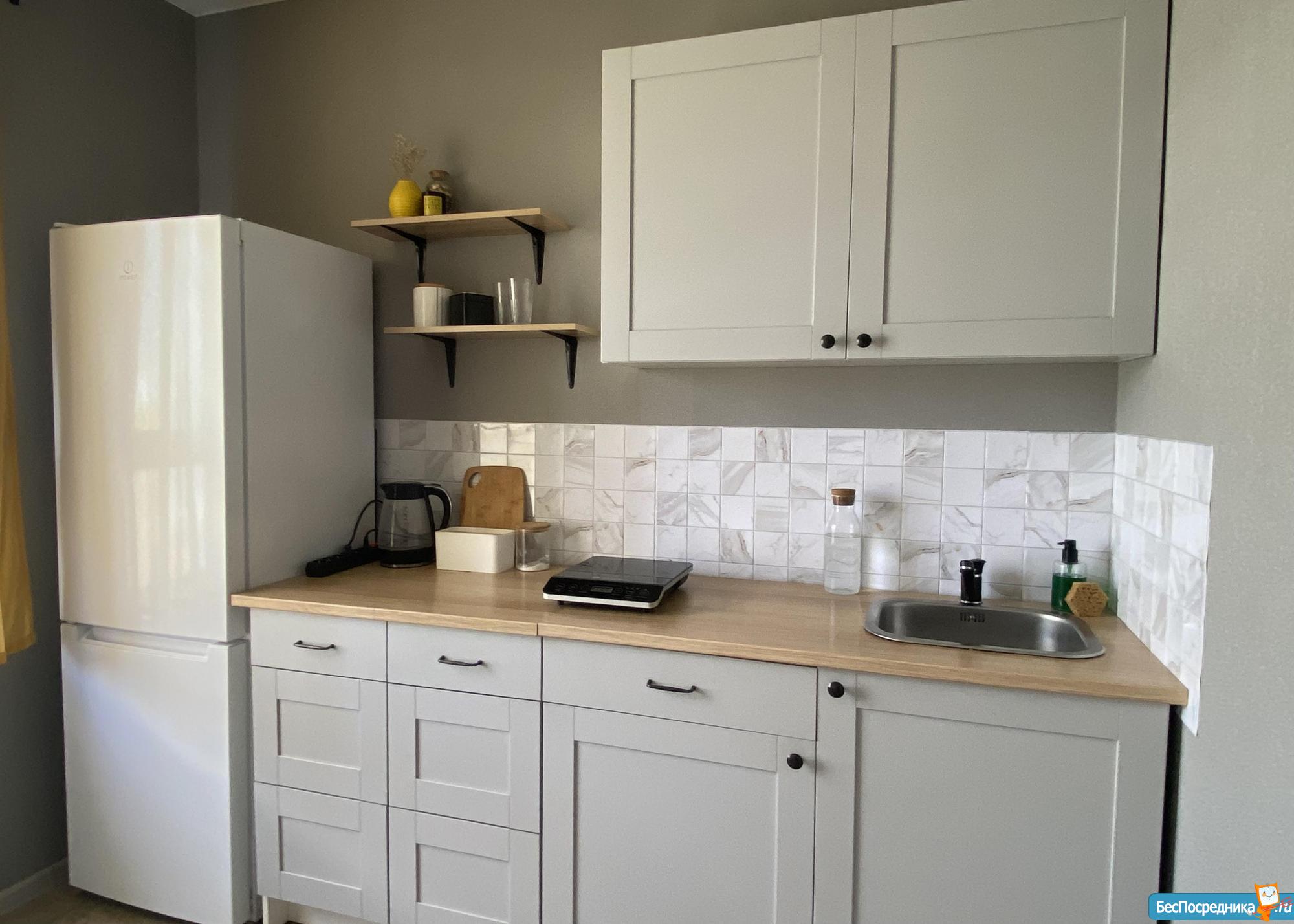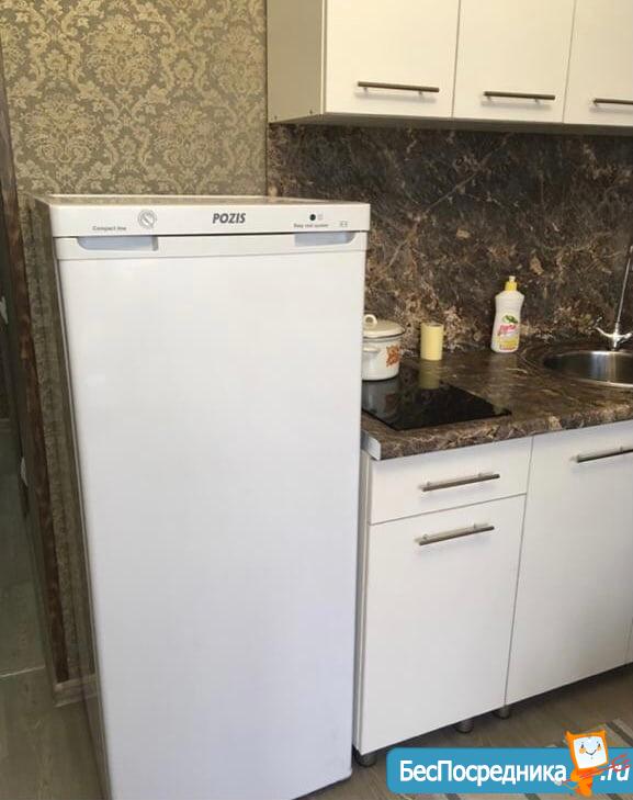 В квартире есть диван-кровать, холодильник, индукционная плита, стиральная машина, утюг и базовый набор мебели - 2 шкафа для хранения вещей, комод, тв тумба, кухонный модуль, обеденный стол и стулья. Также имеются кухонные принадлежности - бокалы, приборы, сковородка и кастрюли, электрочайник.