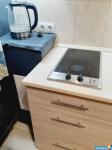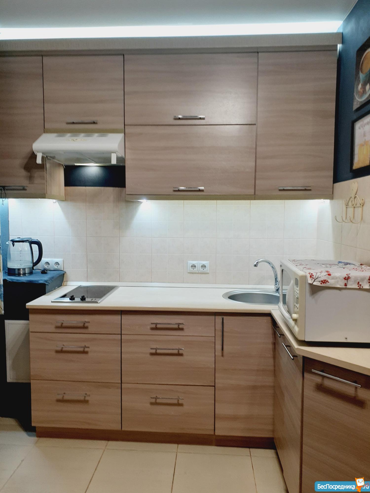эл. плита, необходимая посуда , вытяжка, подсветка рабочей зоны, чайник, микроволновка, Телевизор, сушилка для белья, гладильная доска, пылесос.