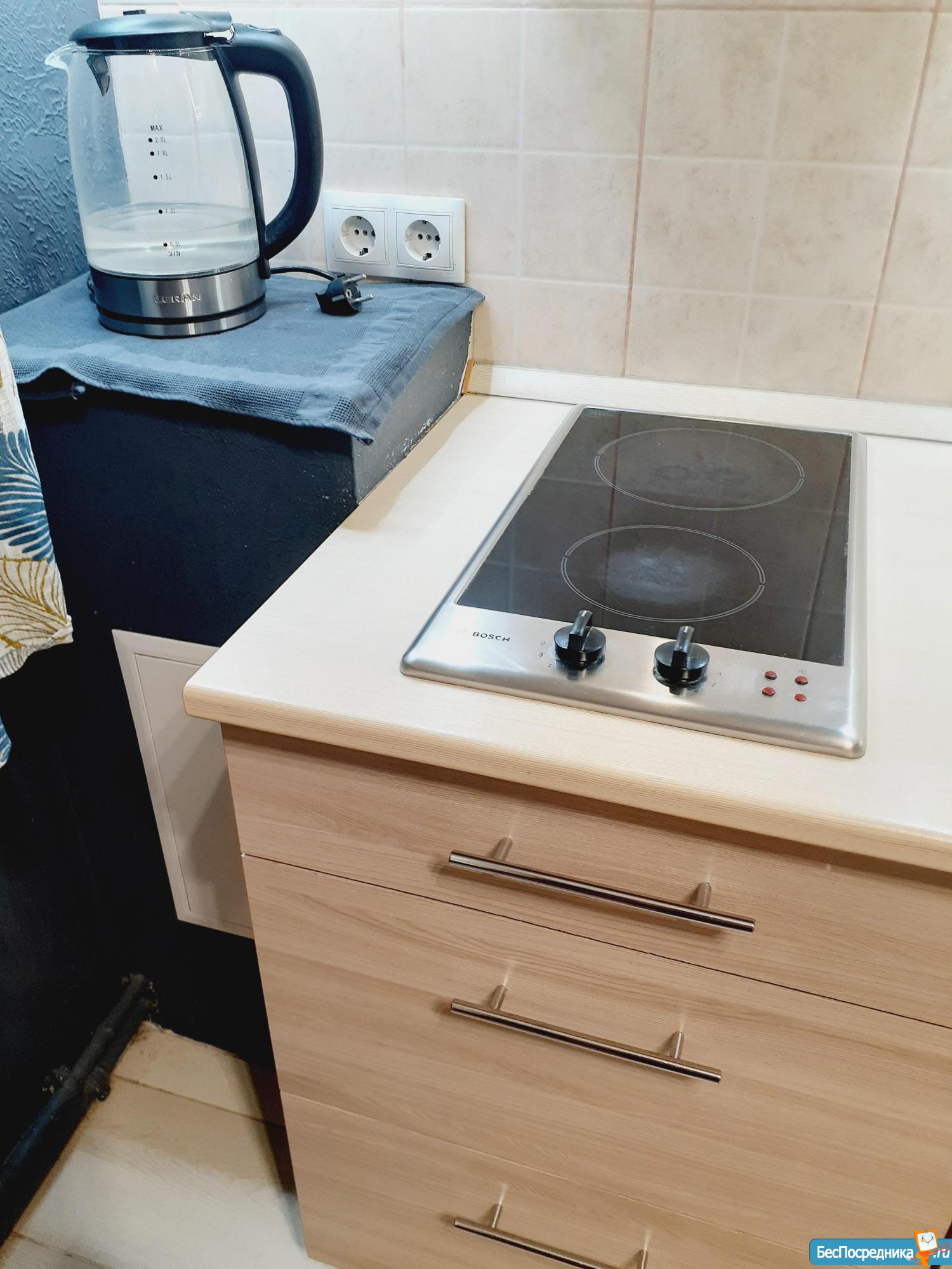 В квартире есть вся необходимая техника для жизни: плита, вытяжка, холодильник, стиральная машина, водонагреватель.