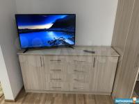 Вся обстановка на фотографиях. В квартире: диван, телевизор, двухместная кровать, шкаф для одежды, тумбочка, комод, прихожая.
