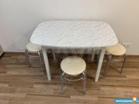 На кухне: кухонный гарнитур, плита с духовкой, холодильник, стол, стулья.