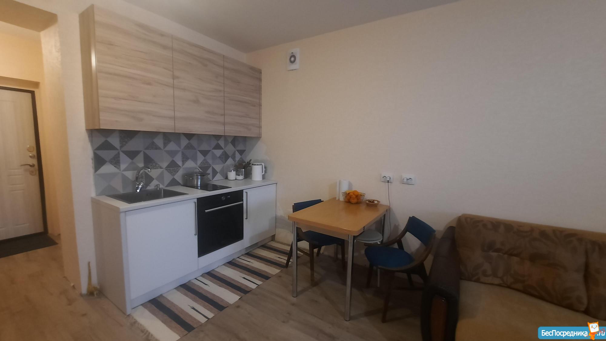 Квартира-студия, в новом доме, ламинат, распашные двери с остеклением в пол, новый кухонный гарнитур, встроенная техника, вся необходимая мебель и техника есть. Есть шкафы для одежды. Рядом новый детский сад и школа. Оплата 20000р+квитанция. Залог 20 т.р. Без посредников и комиссии.