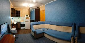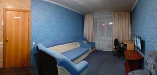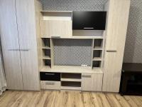 В комнате имеется все для комфортного проживания: шкаф-купе, диван, кресло, компьютерный стол + стул, журнальный стол, телевизор, кухонный гарнитур с раковиной (вода в комнате), плита, микроволновка, холодильник.