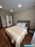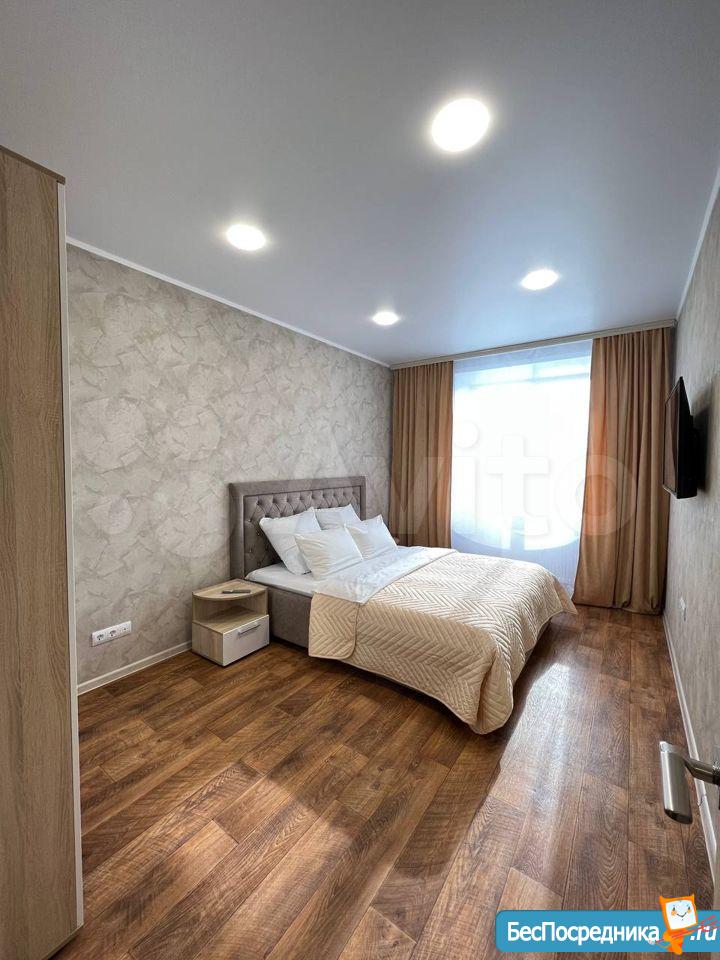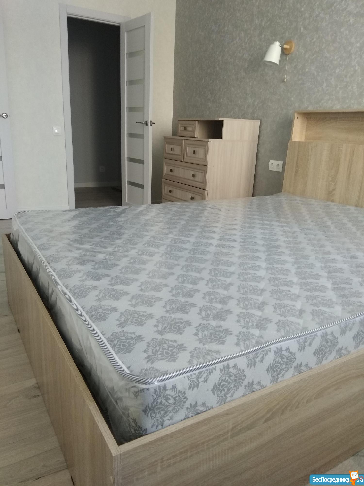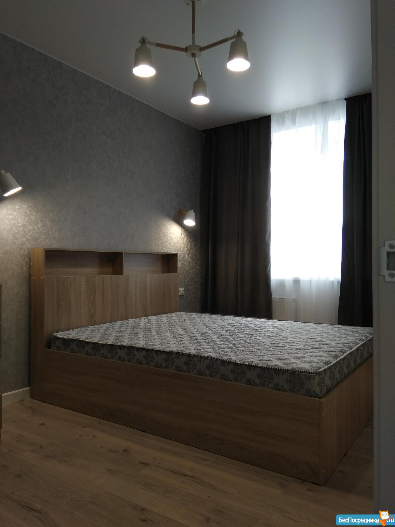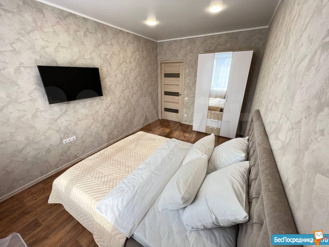 Просторная спальня с большой двуспальной кроватью 160х200 оборудована телевизором, вместительным шкафом для одежды. Кухня оснащена бытовой техникой: холодильником, варочной панелью, микроволновкой. На кухне раскладывающийся диван с дополнительным вместительным спальным местом. Вся мебель новая.