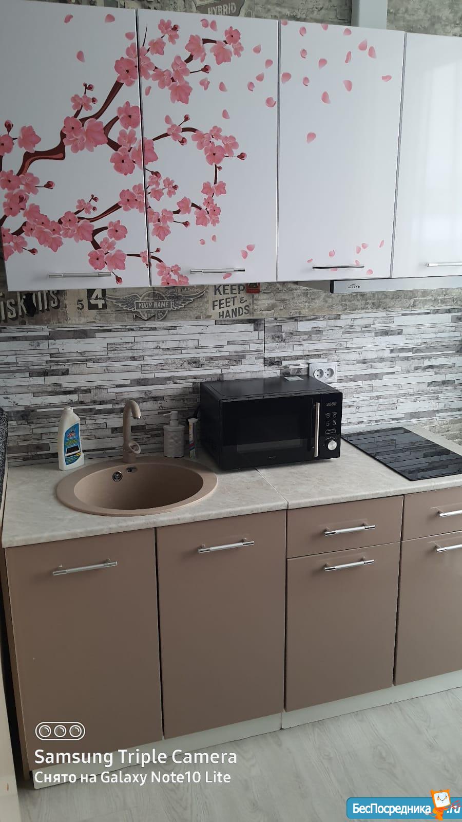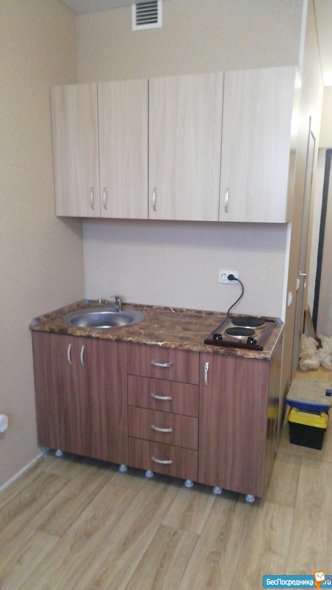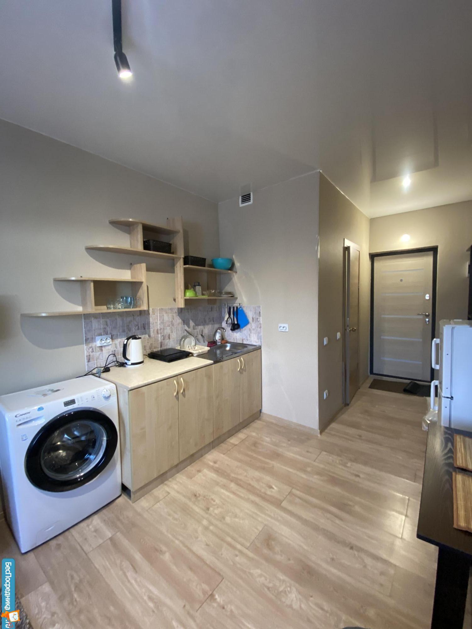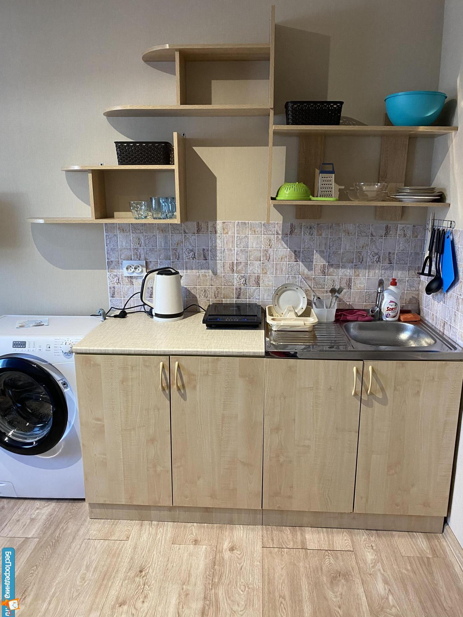 В квартире (кухонный гарнитур, индукционная плита, небольшой холодильник, диван) все для жизни есть кроме стиральной машины
