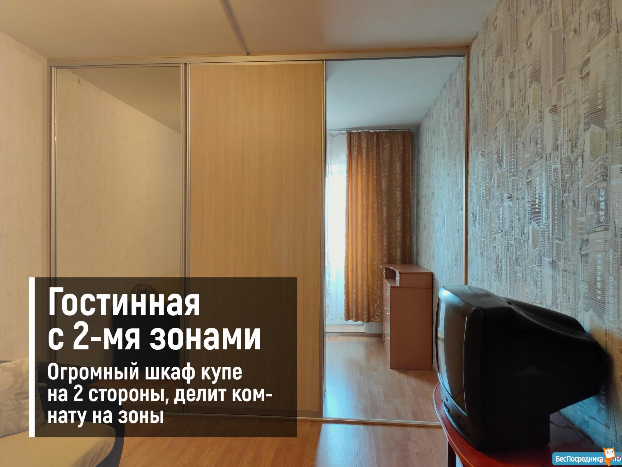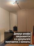 - Огромный шкаф-купе на 2 стороны, разделяющий весь зал на 2 зоны. Дальняя комната может стать как уютной спальней, так и комфортным рабочим местом. Дверь шкафа закрывается, благодаря чему зона становится полноценной комнатой