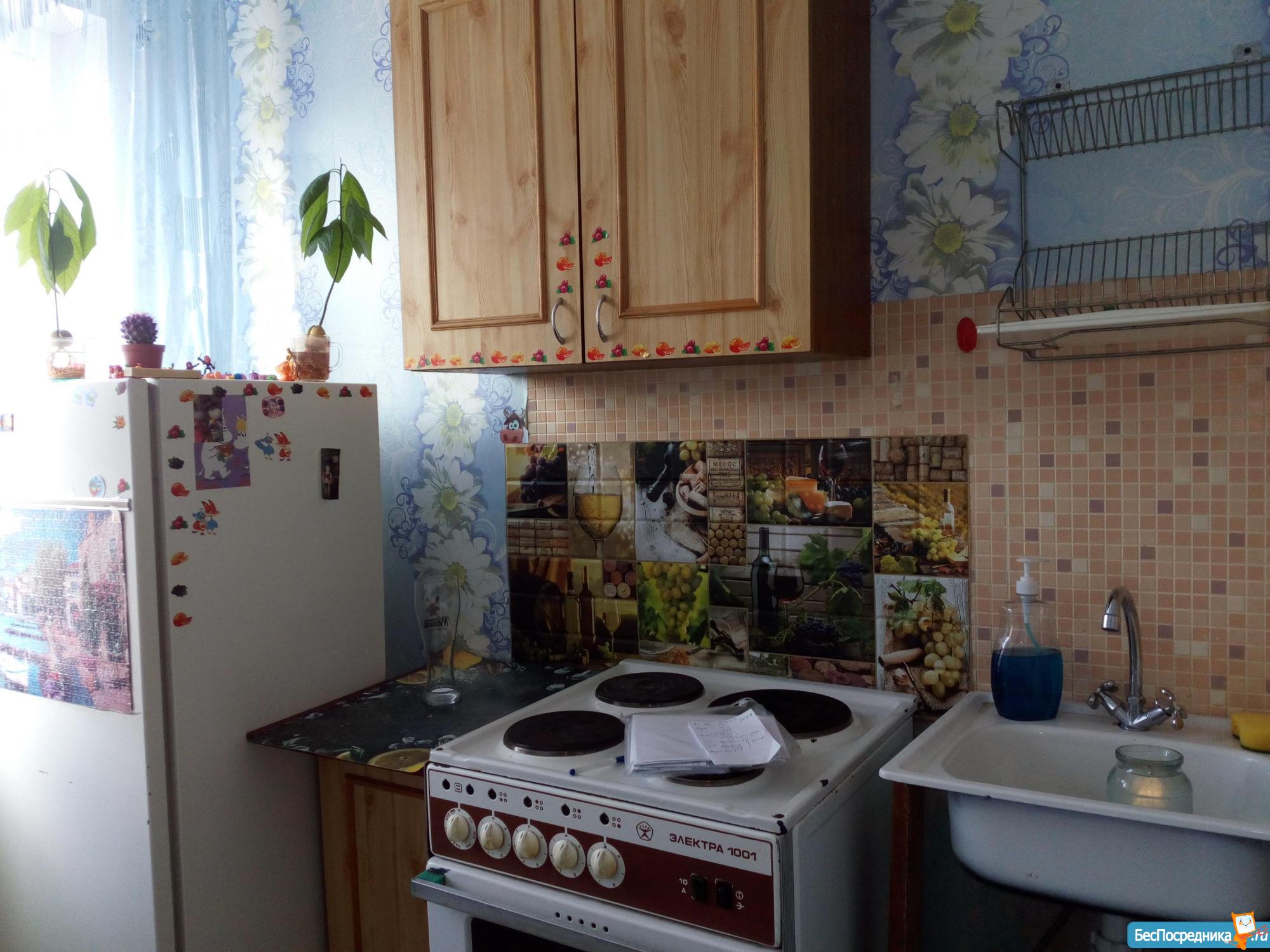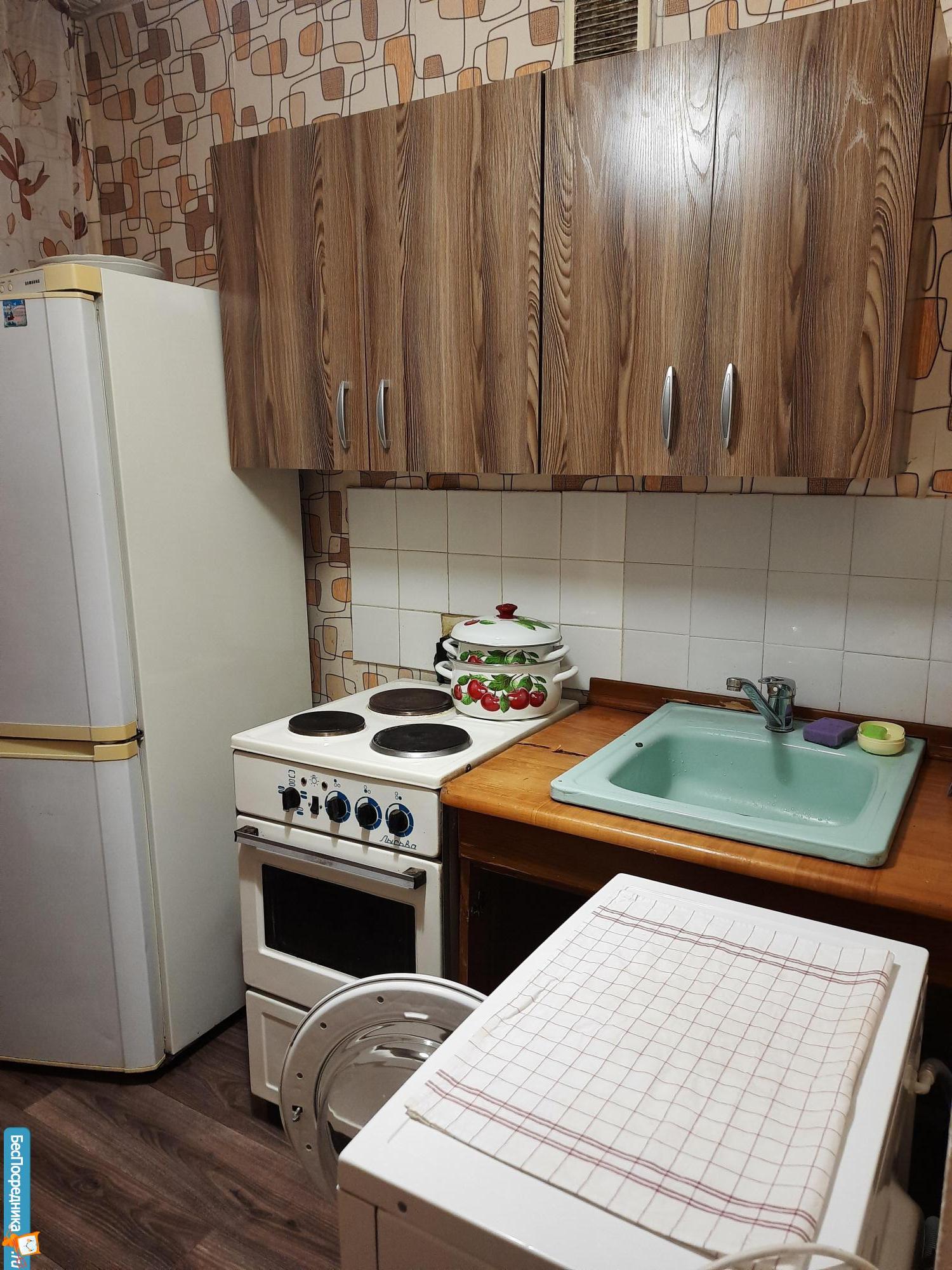 Квартира в нормальном состоянии. Есть счетчики на воду. Из мебели есть кухонный гарнитур, плита электрическая, холодильник, машинка стиральная. В комнате диван, встроенный шкаф в коридоре.