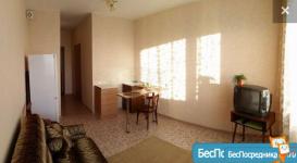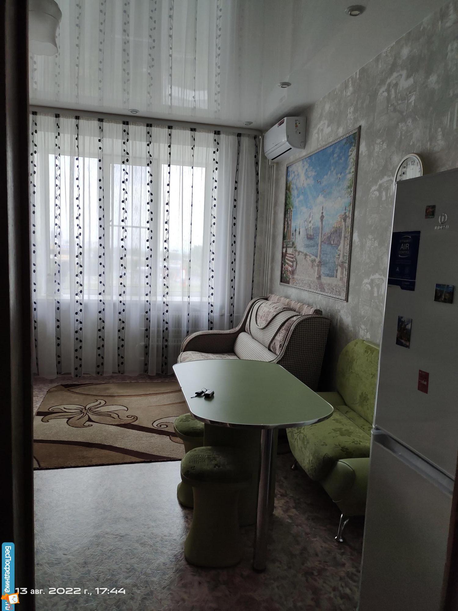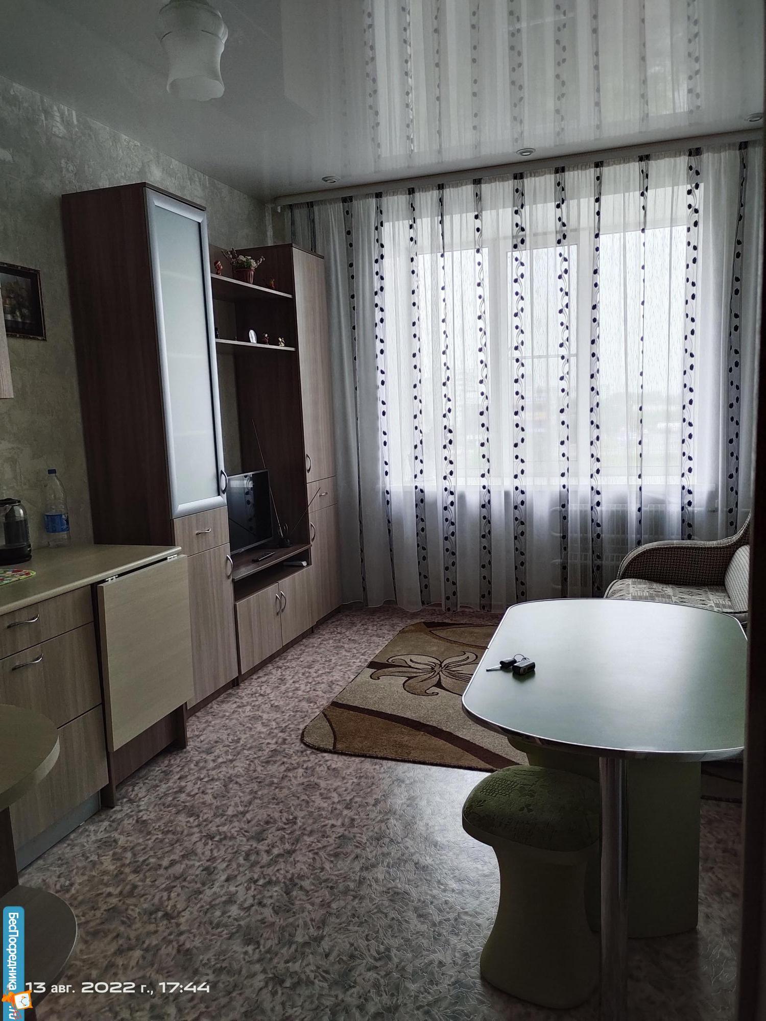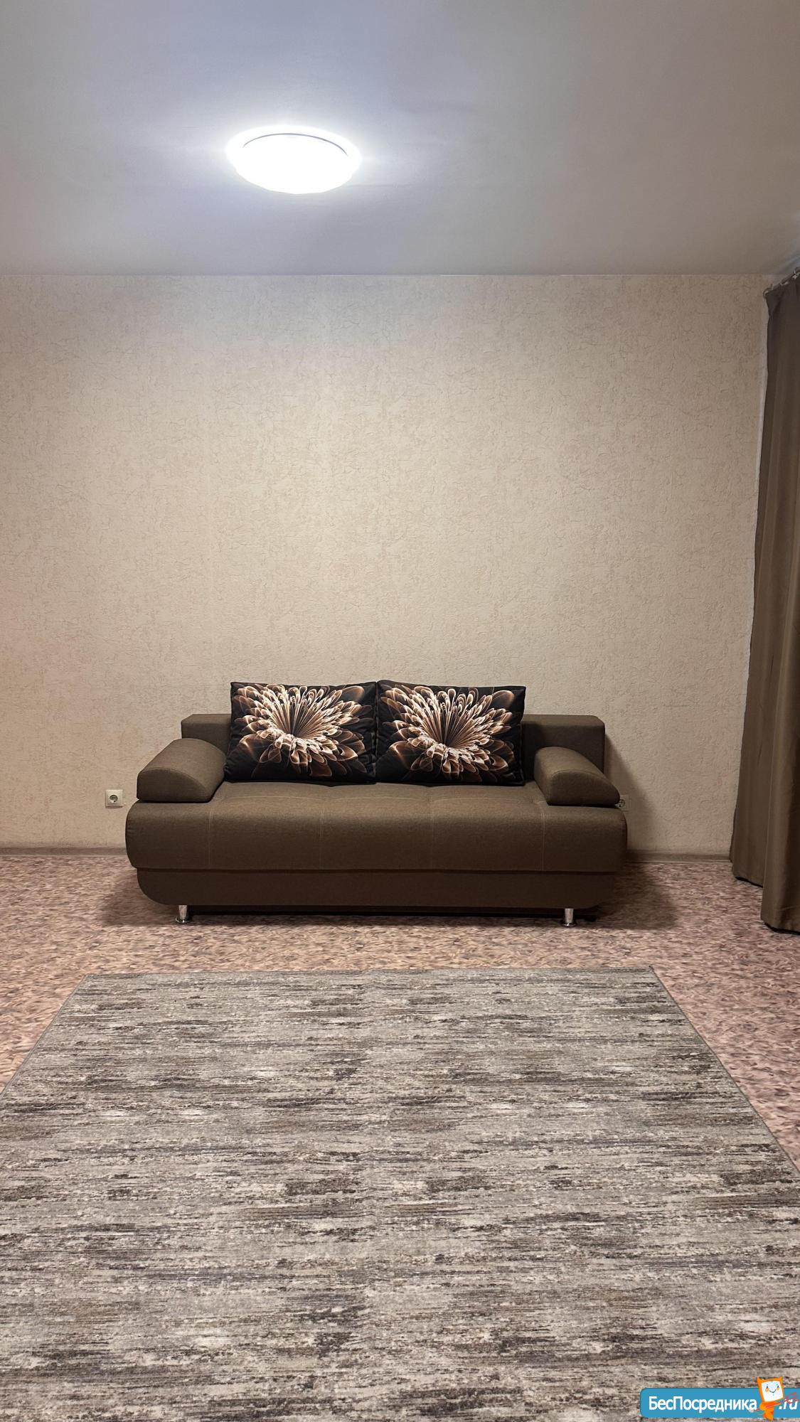 В квартире абсолютно новые диван, кухонный стол со стульями, шторы и ковер.