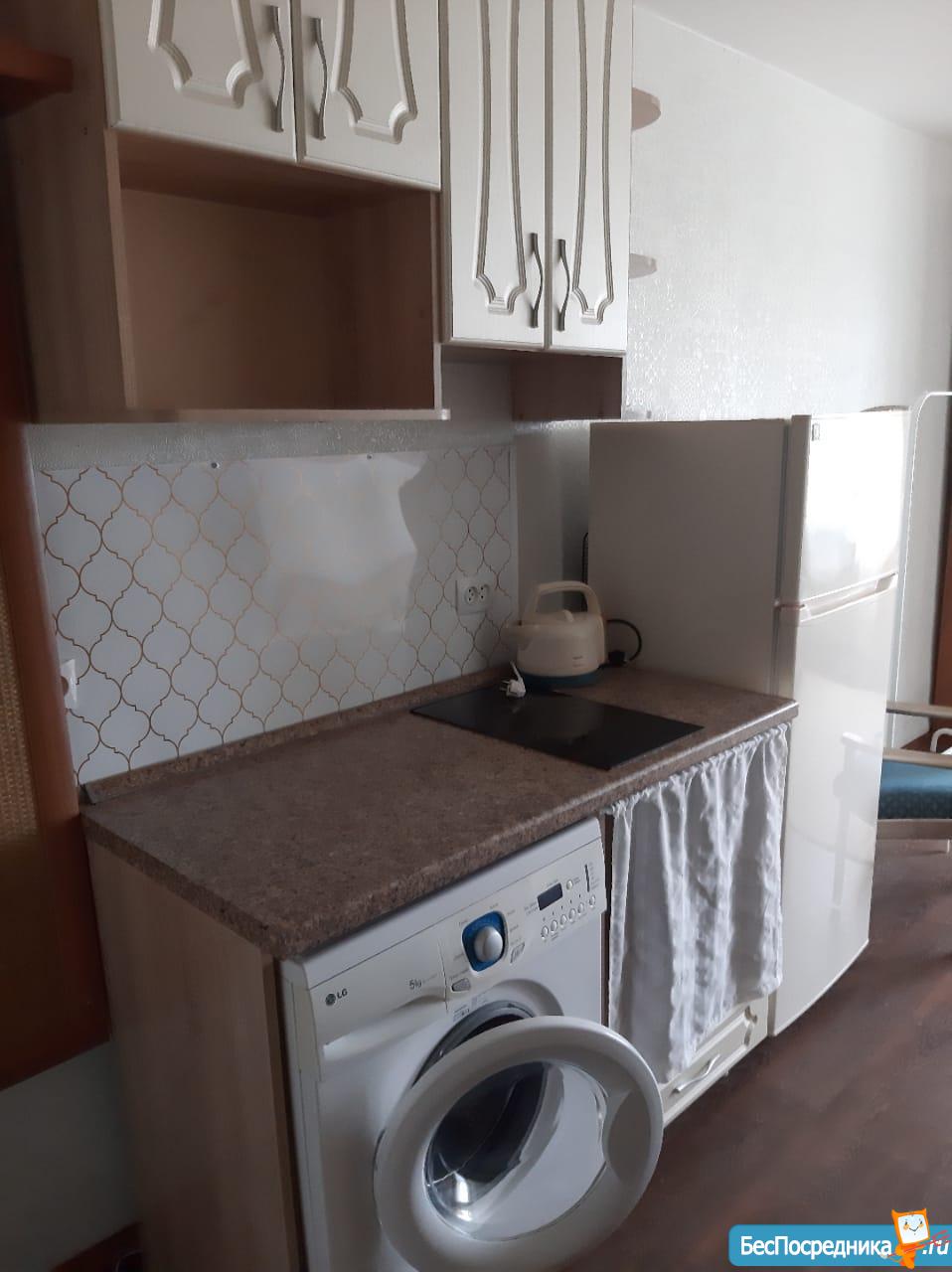 Уютная студия, мебелированная. Есть встроенная плита, микроволновка,чайник, новые стиральная машинка и холодильник, утюг, гладильная доска, стол, все что на фото. Оплата 26 000 р и счетчики.