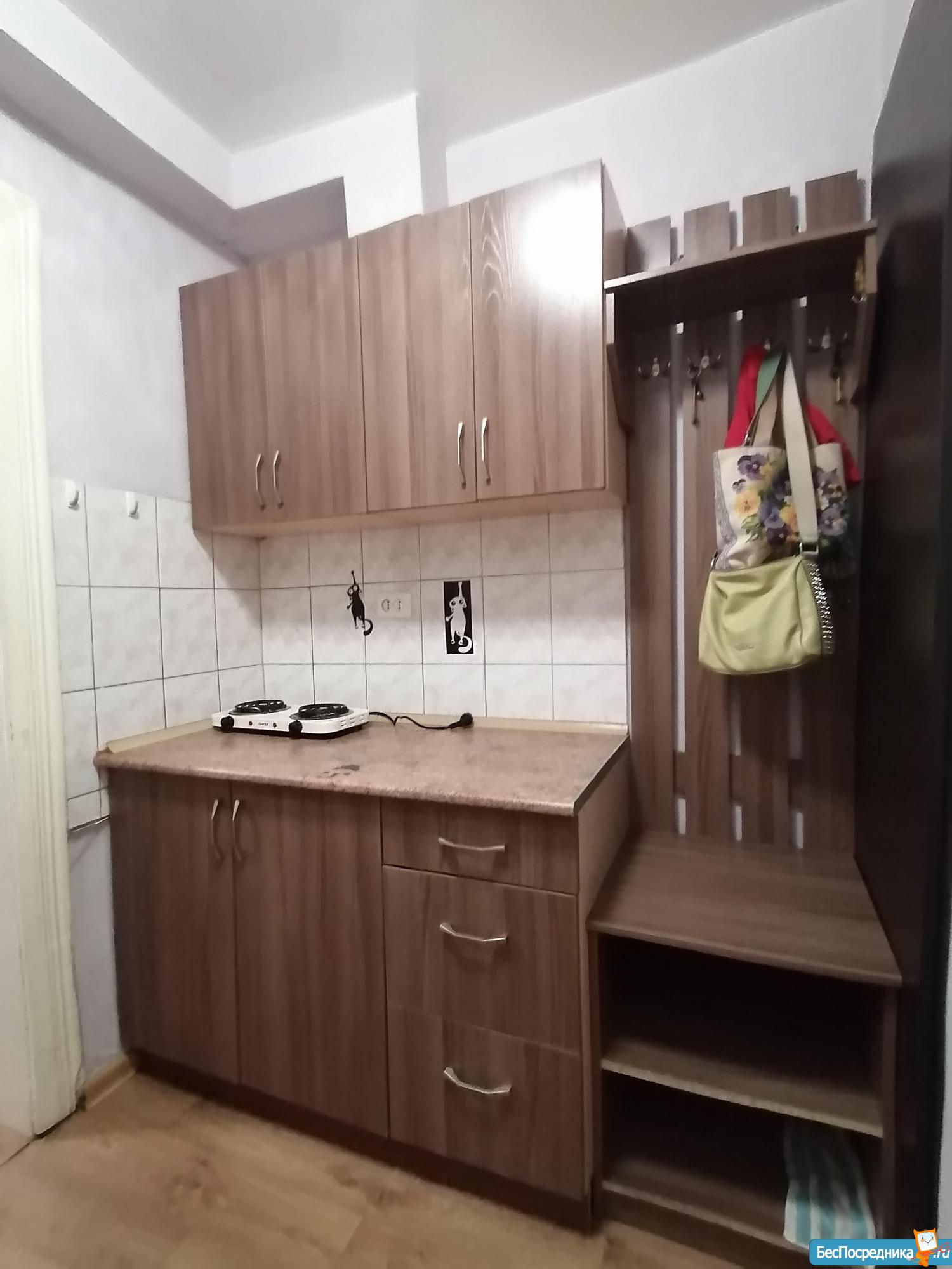 Сдам студию в центре. Тёплая, меблированная: диван, стенка, стол(2), глад. доска, утюг, сушилка для белья. Холодильник, эл.чайник, эл. плитка, , посуда.
