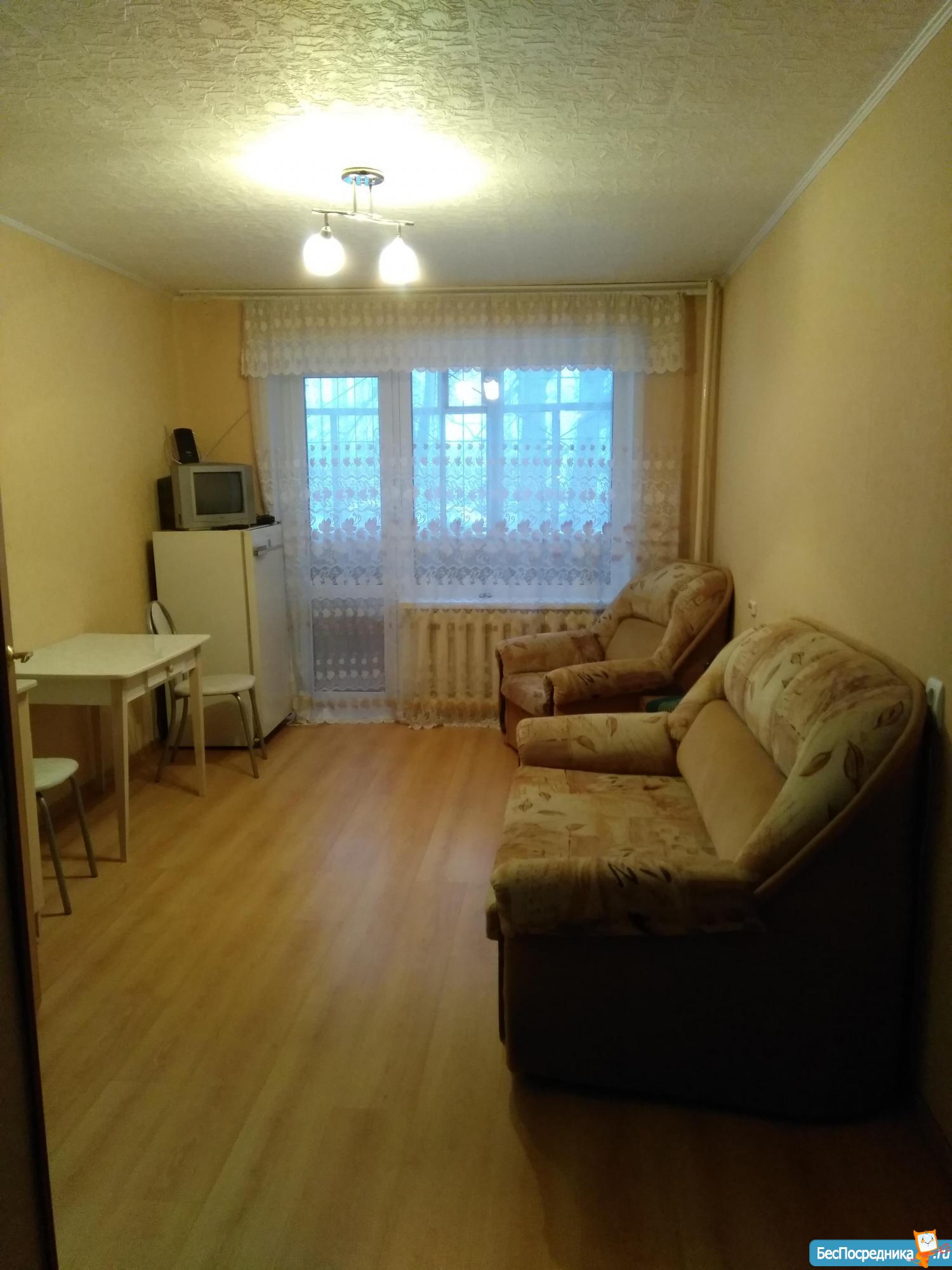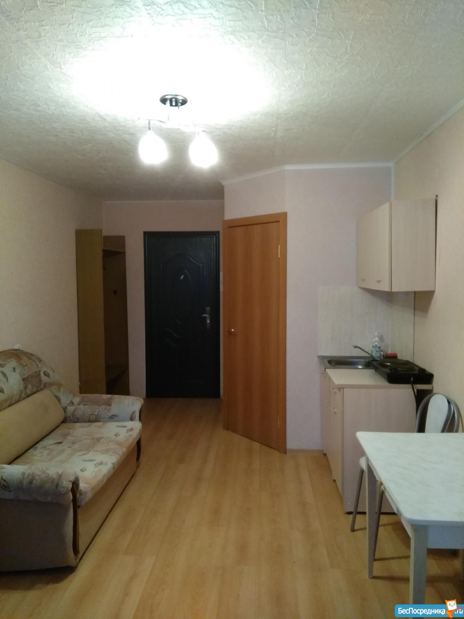 Студия с балконом. Необходимая для проживания мебель и техника есть. Вся необходимая инфраструктура в шаговой доступности.