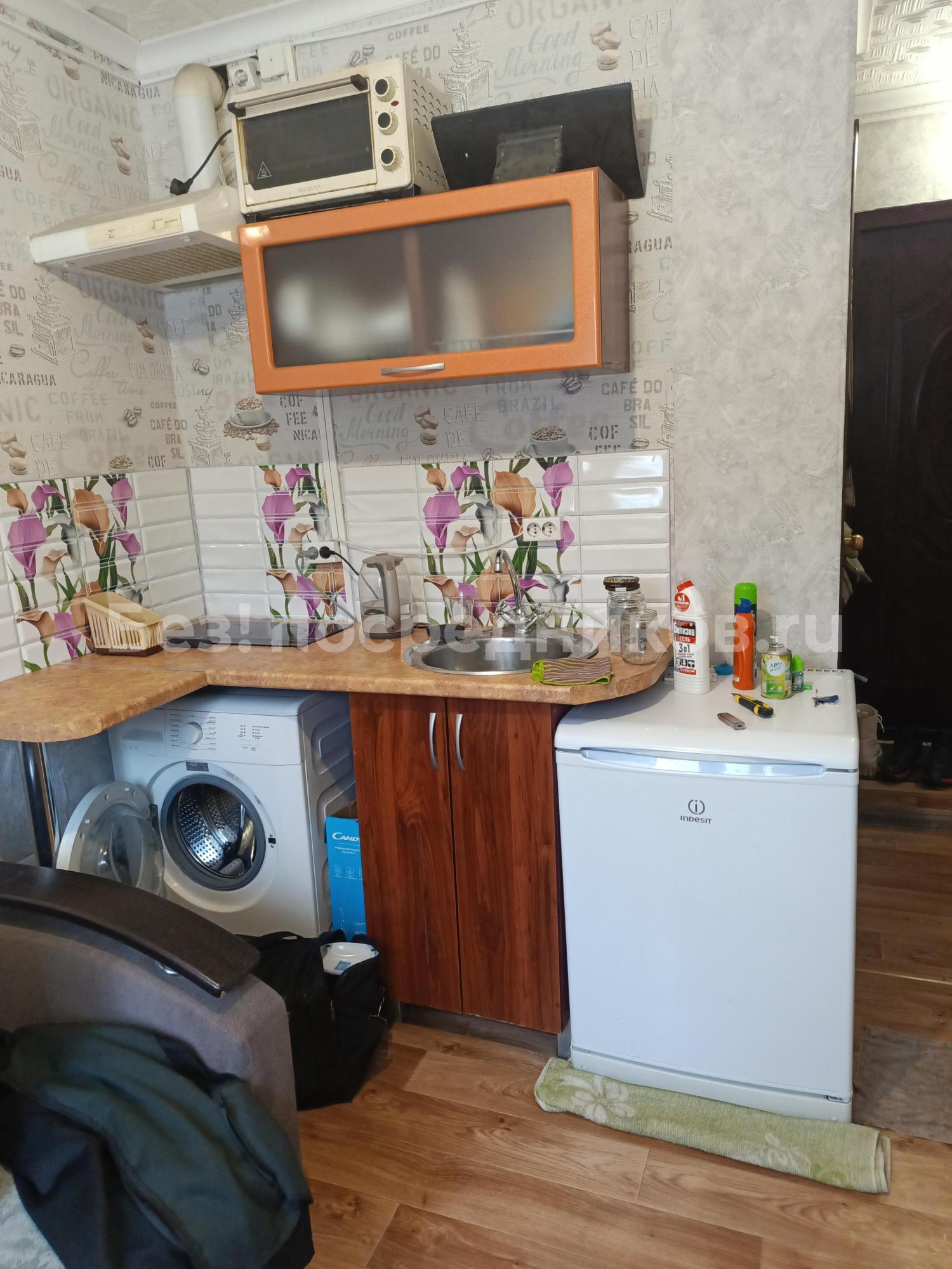 Из мебели имеется шкаф, диван, кухня с варочной поверхностью, элетрический чайник, холодильник, стиральная машина.