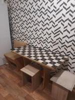- Мебель и техника: кухонный стол с двумя стульями, холодильник, плита, шкаф для одежды, стиральная машина, диван, телевизор, комод