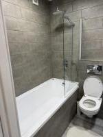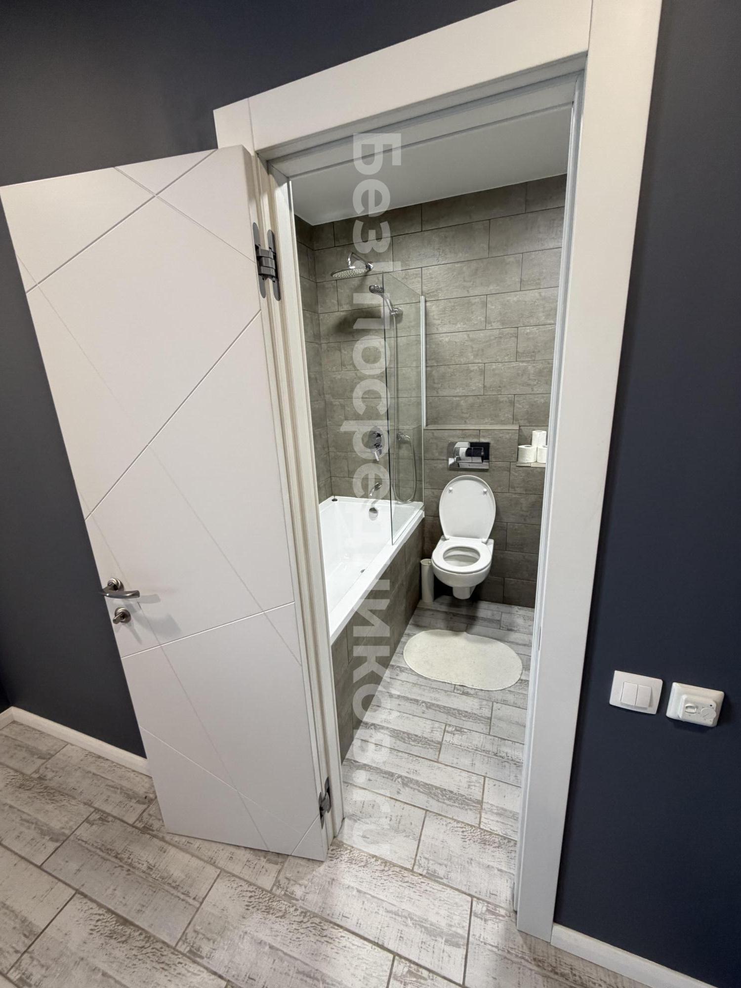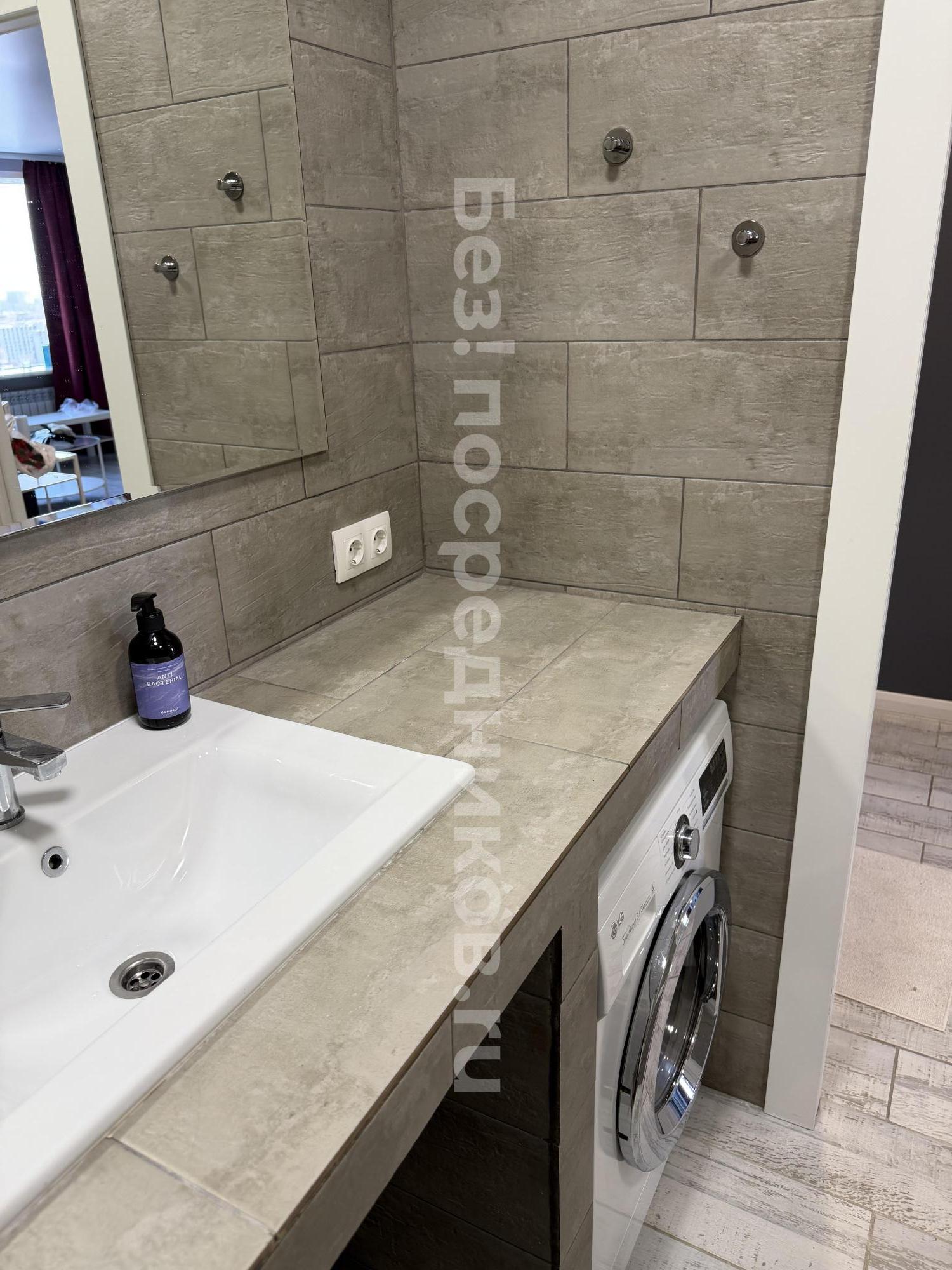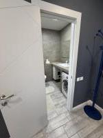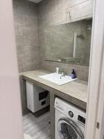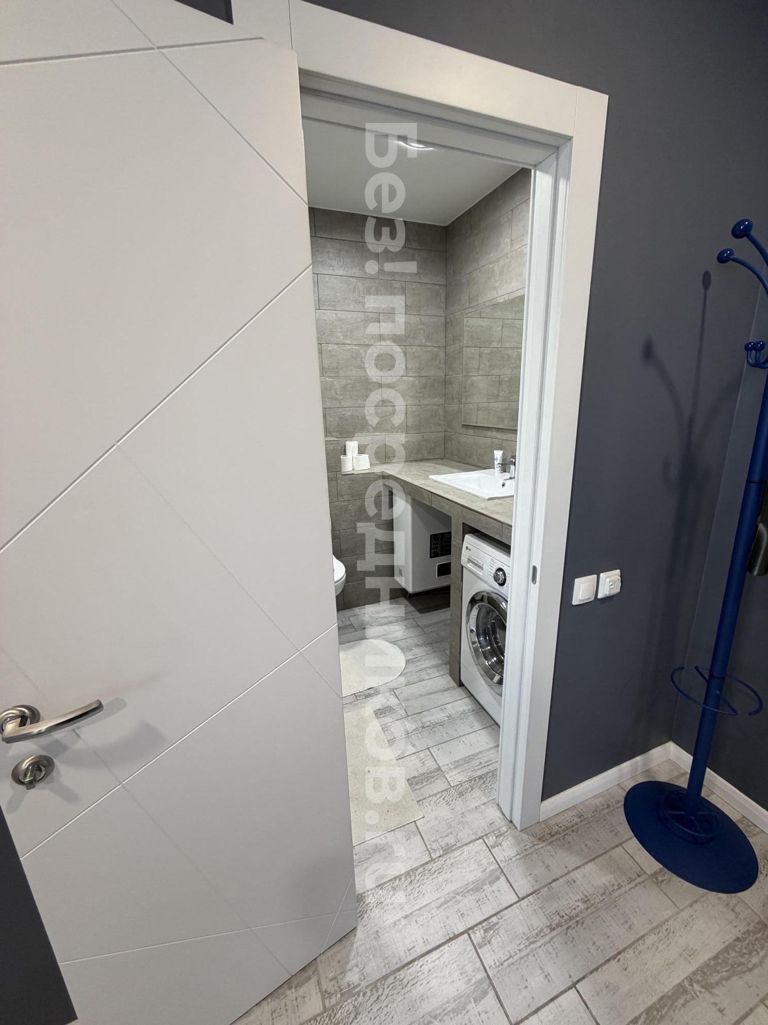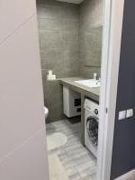 Санузел раздельный, оформлен в современном стиле с использованием качественных материалов. В ванной комнате установлена ванна, стиральная машина.