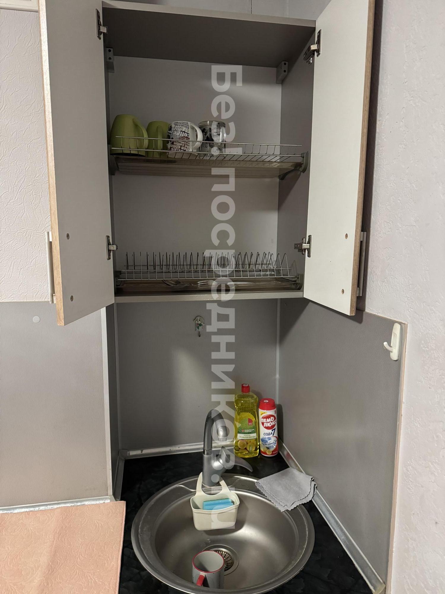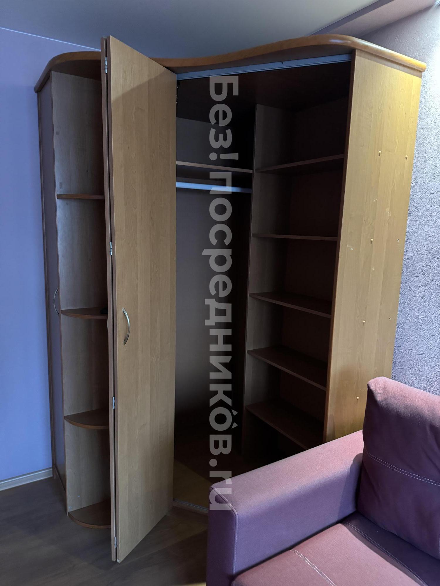 В квартире есть два дивана, большой угловой шкаф, телевизор, холодильник, стиральная машинка, духовая плита, чайник.