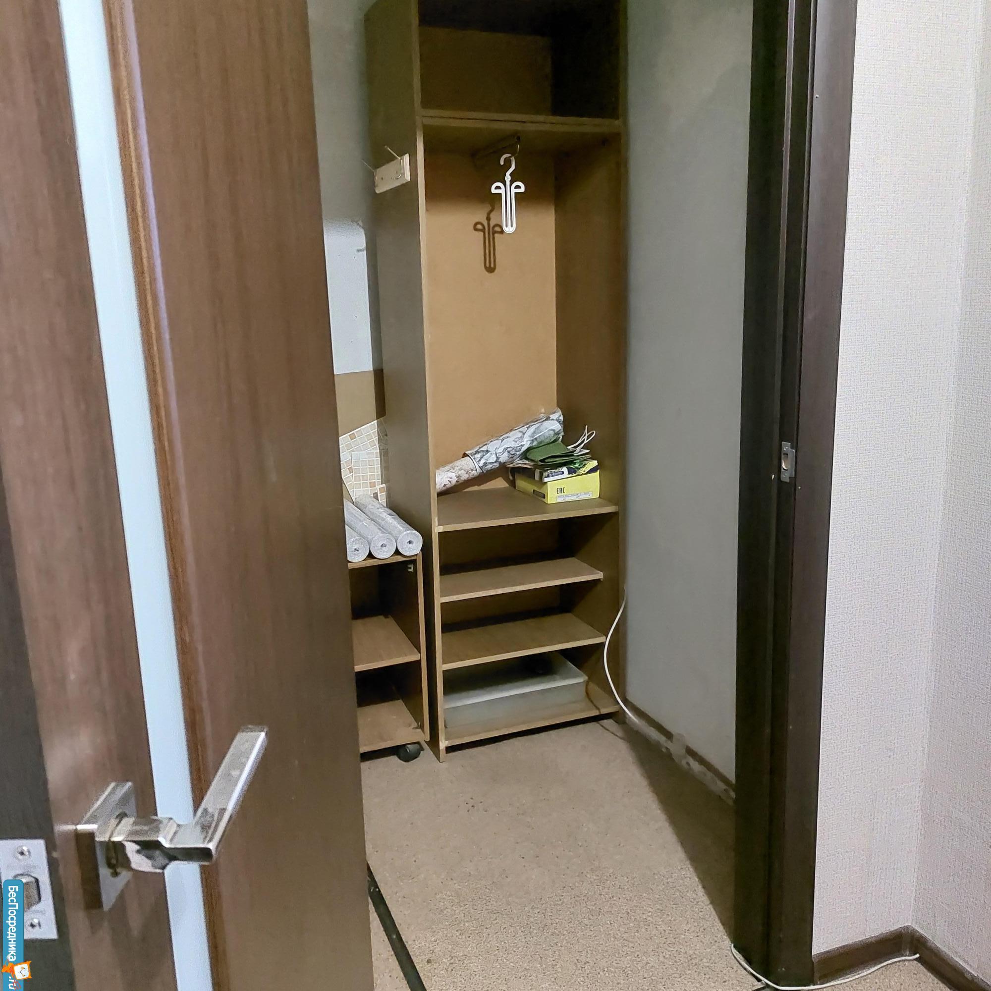 В коридоре встроенный шкаф-купе, вешалка для одежды, полочка для обуви, пылесос.